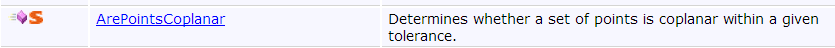 The ArePointsCoplanar has the following syntax, parameters, and the return value.