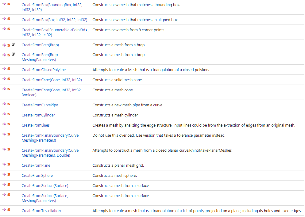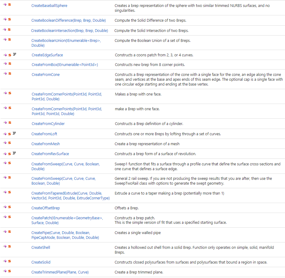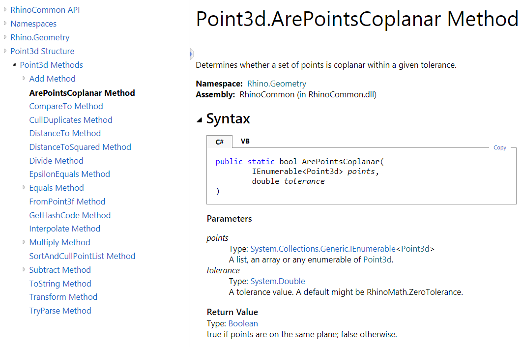 Point3d has static methods that are accessible without instantiating an instance of Point3d. For example, if you would like to check if a list of given instances of points are all coplanar, you can call the static method Point3d.ArePointsCoplanar without creating an instance of a point. Static methods have the little red “s” symbol in front of them in the documentation.
