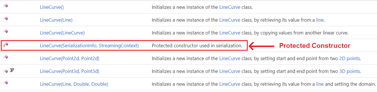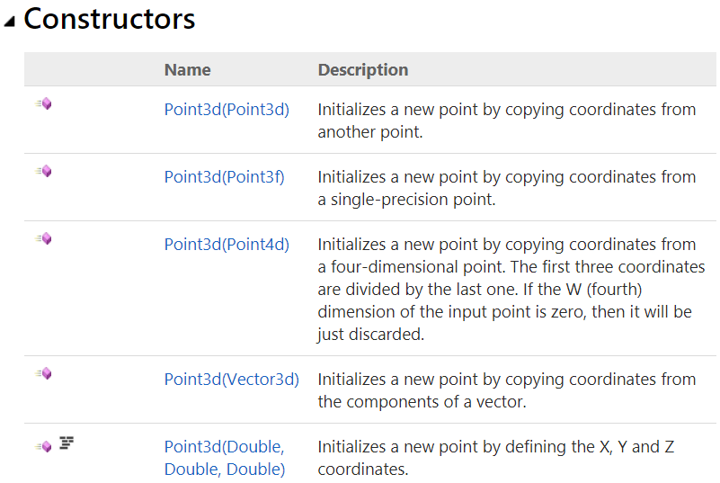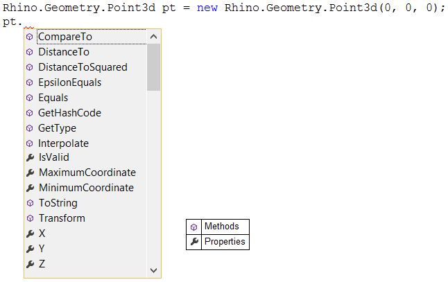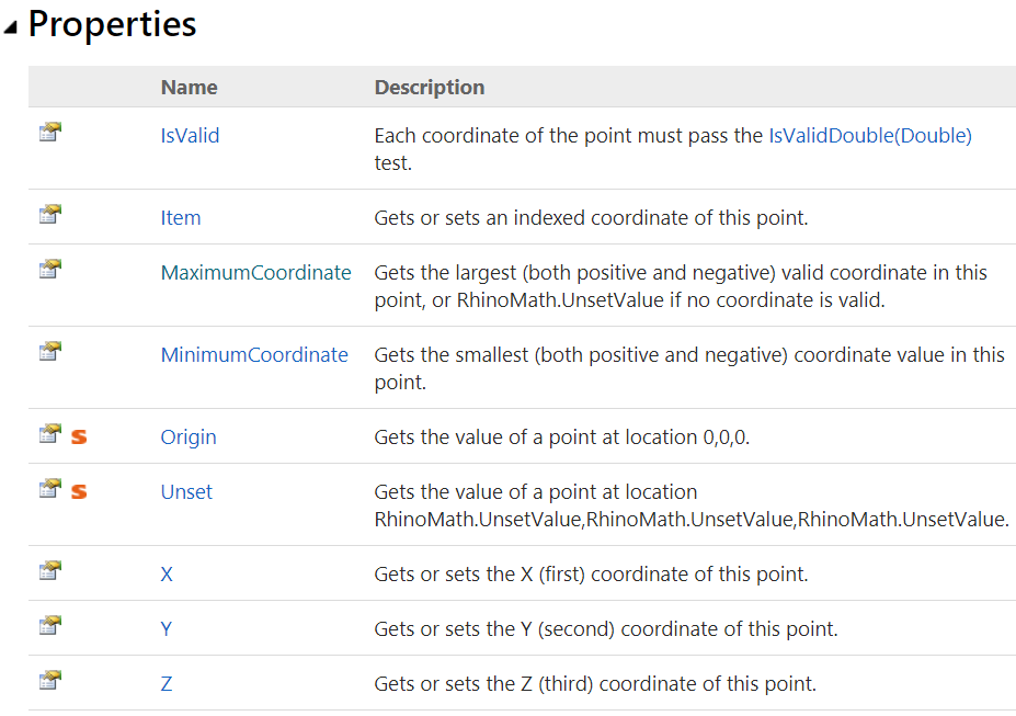 Properties are mostly used to “get” and/or “set” the fields of the structure. For example, there are the “X”, “Y”, and “Z” properties to get & set the coordinates of an instance of Point3d. Properties can be static to get specific points, such as the origin of the coordinate system (0,0,0). The following are Point3d properties as they appear in the documentation: