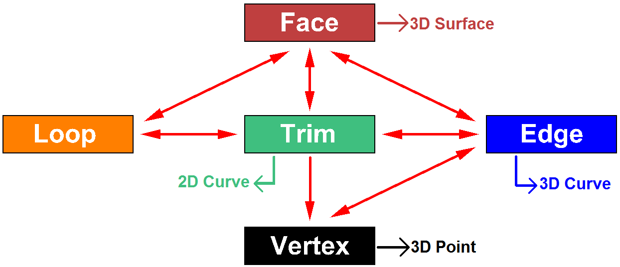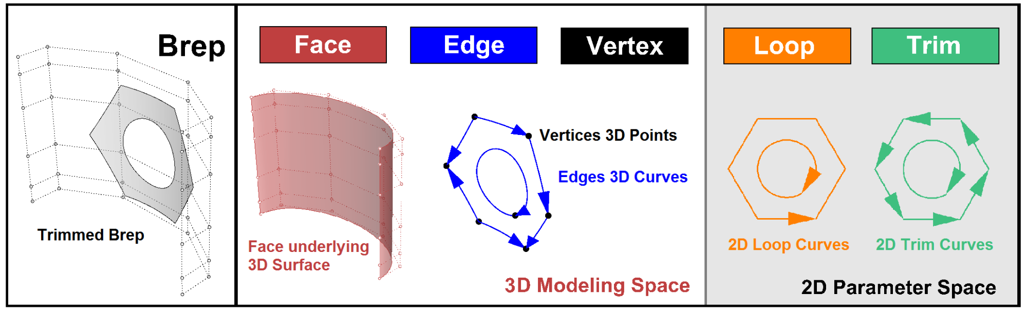 Point3d | Location in 3D space. There are other points that have different dimensions such as: Point2d (parameter space point) and Point4d to represent control points. |