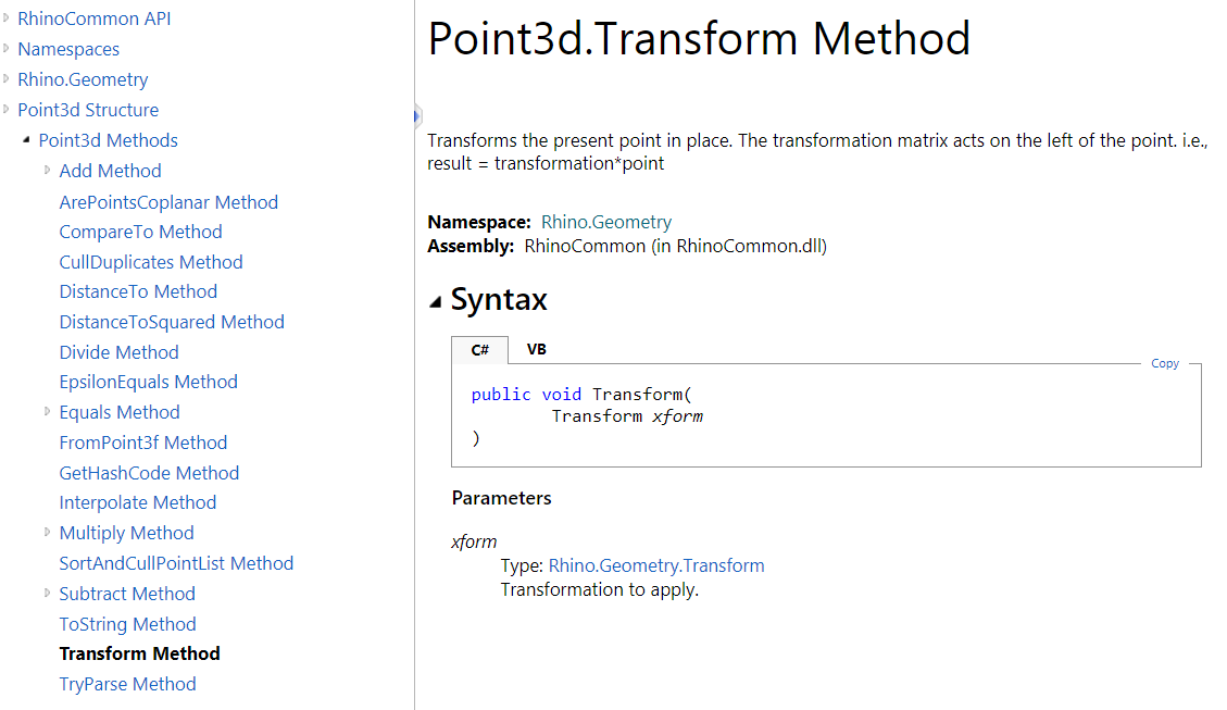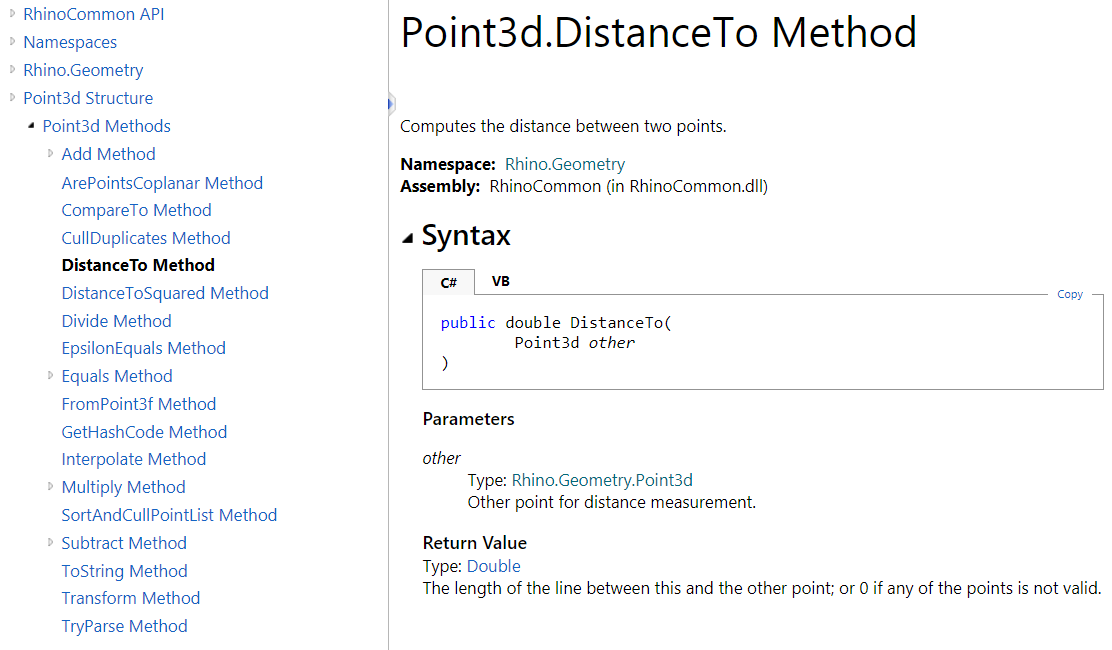 The methods are used to help inquire about the data or perform specific calculations, comparisons, etc. For example, Point3d has a method to measure the distance to another point. All methods are listed in the documentation with full details about the parameters and the return value, and sometimes an example to show how they are used. In the documentation, Parameters refer to the input passed to the method and the Return Value describes the data returned to the caller. Notice that all methods can also be navigated through the left menu.