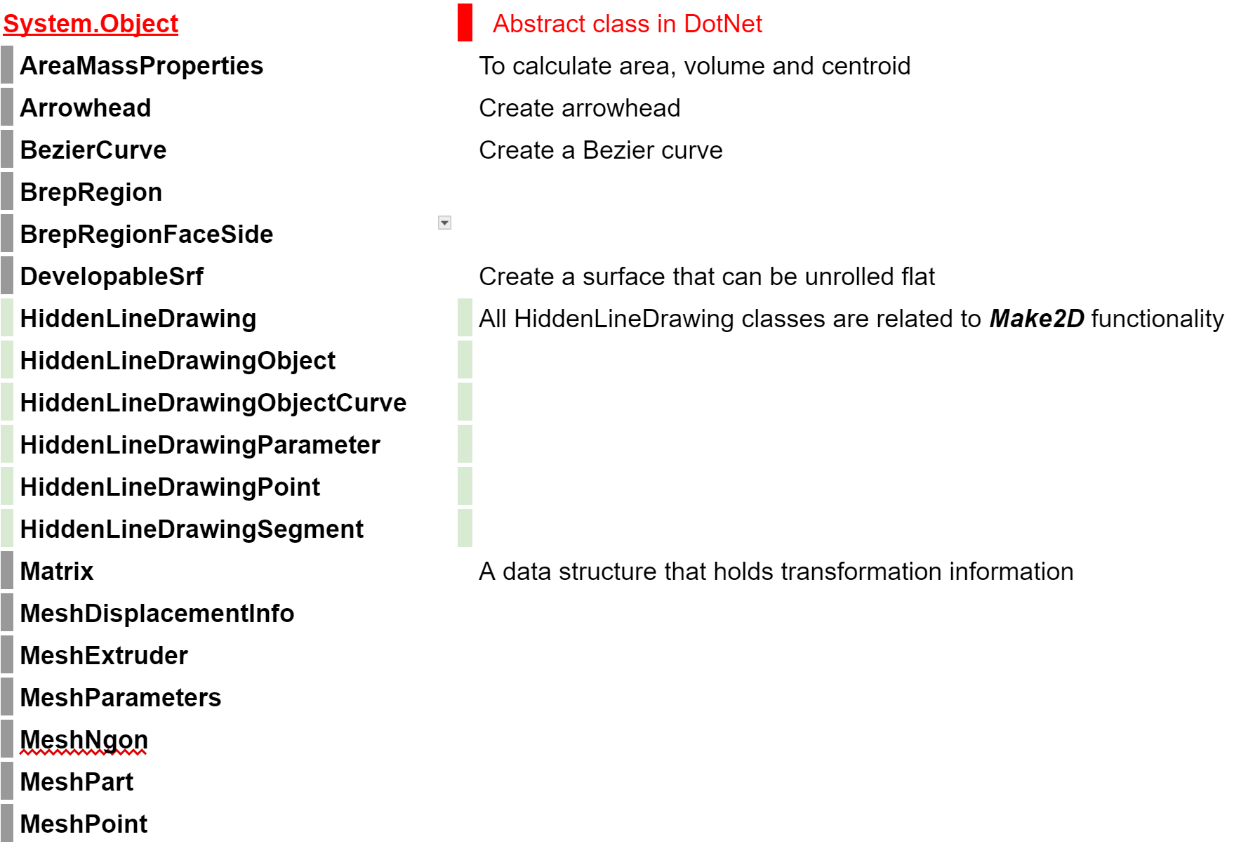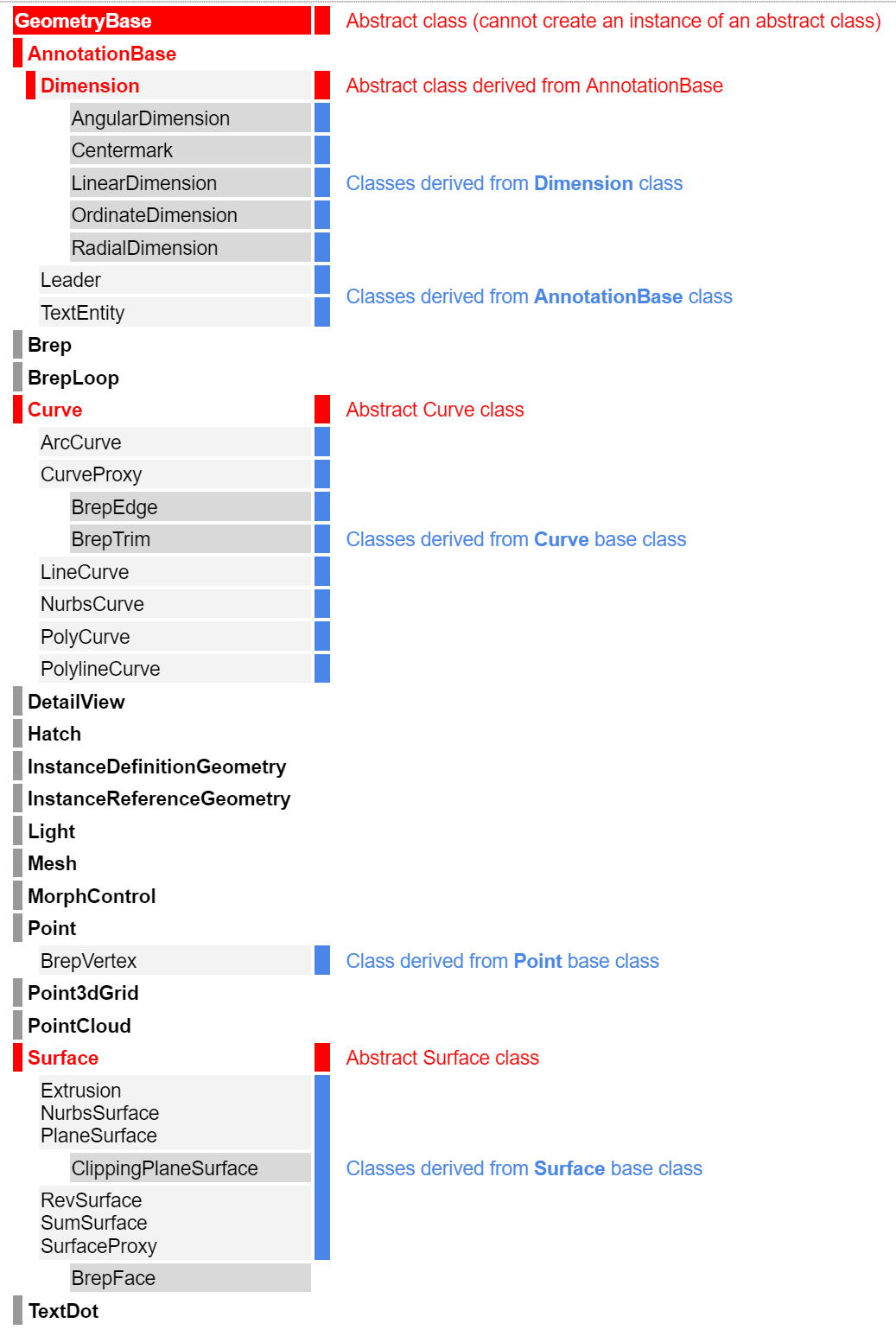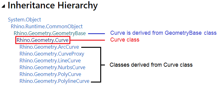 There are many important classes under the Rhino.Geometry namespace that are not derived from GeometryBase. Those are commonly used when writing scripts to create & manipulate geometry. We used a couple of them in the examples. You can find the full list of RhinoCommon classes in the documentation. Most of these classes are derived directly from the C# abstract class System.Object. This is the inheritance hierarchy for these classes: