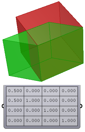 The Transform structure is a 4x4 matrix with several methods to help create geometry transformations. This includes defining a shear, projection, rotation, mirror, and others. The structure also has functions that support operations such as multiplication & transpose. For more information about the mathematics of transformations, please refer to “The Essential Mathematics for Computational Design”. The following examples show how to create a shear transform & planar projection: