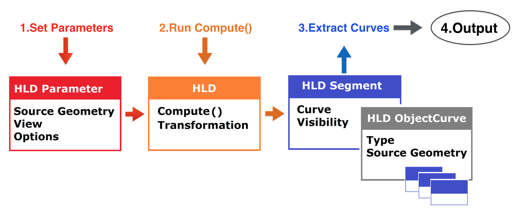The first step involves setting the parameters such as the source geometry, view, and all other options. Once the parameters are set, the HLD core class can calculate all the lines and hand back to the HLD Segment class with all visibility information & associated source. The user can then use this information to create the final drawing.