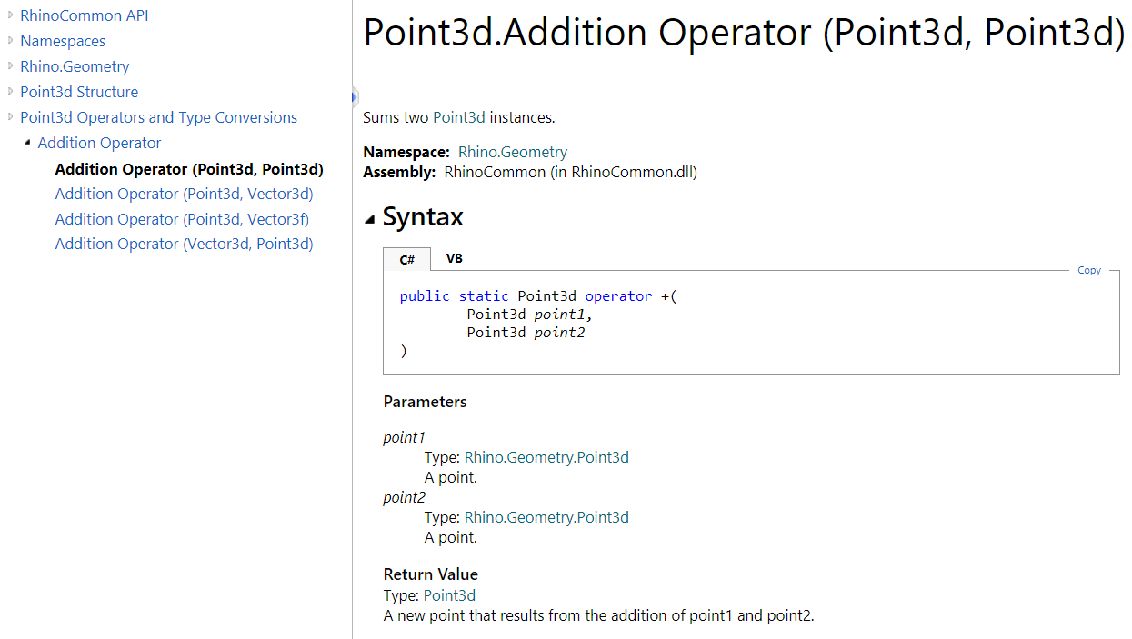 Many Structures & Classes in RhinoCommon implement operators whenever relevant. Operators enable you to use the “+” to add two points or use the “=” to assign the coordinates of one point to the other. Point3d structure implements many operators, and this simplifies the coding & its readability. Although it is fairly intuitive in most cases, you should check the documentation to verify which operators are implemented and what they return. For example, the documentation of adding 2 Point3d indicates the result is a new instance of Point3d where X, Y, and Z are calculated by adding corresponding fields of 2 input Point3d.