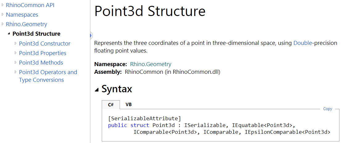 The Point3d type includes three fields (X, Y, and Z). It defines a number of properties and also has constructors and methods. We will walk through all the different parts of Point3d and how it is listed in the RhinoCommon documentation. First, you can navigate to Point3d from the left menu under the Rhino.Geometry namespace. When you click on it, the full documentation appears on the right. At the very top, you will see the following: