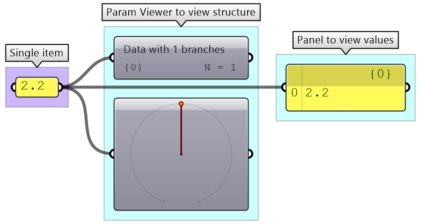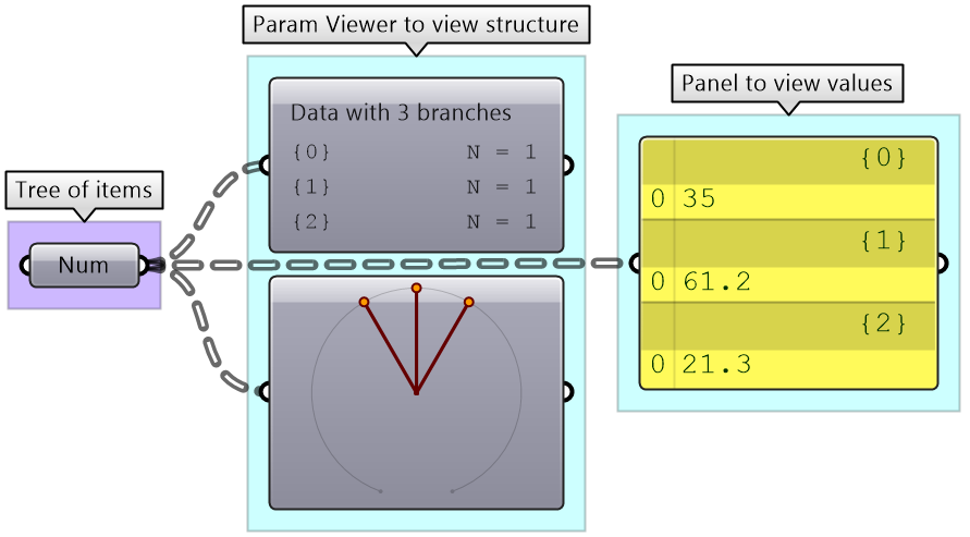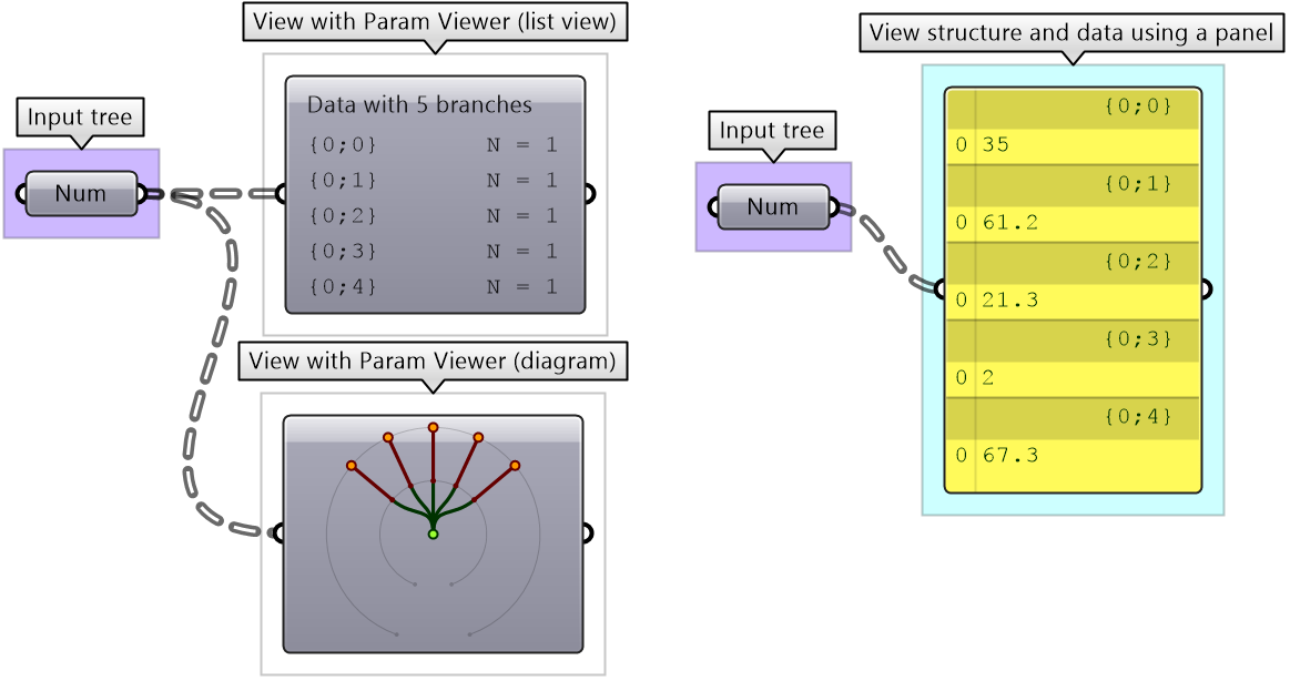As we have seen in the data matching, different data structures of the same set of elements produce different results. Grasshopper offers three ways to view the data structure, the Parameter Viewer in text or diagram format, and the Panel.