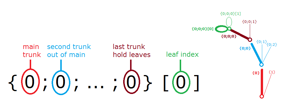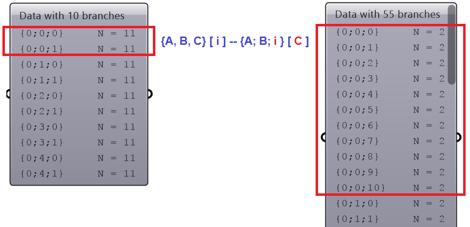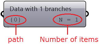 The first step to understanding data trees is to learn the GH notation of trees. As we have seen from the examples, trees consist of branches, and each branch holds a number of elements. The address or path of each branch is represented with integers separated by semicolons and enclosed in curly brackets. The index of each element is enclosed by square brackets. This diagram shows a breakdown of the address of elements in trees.