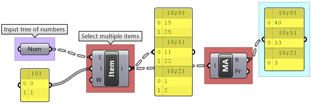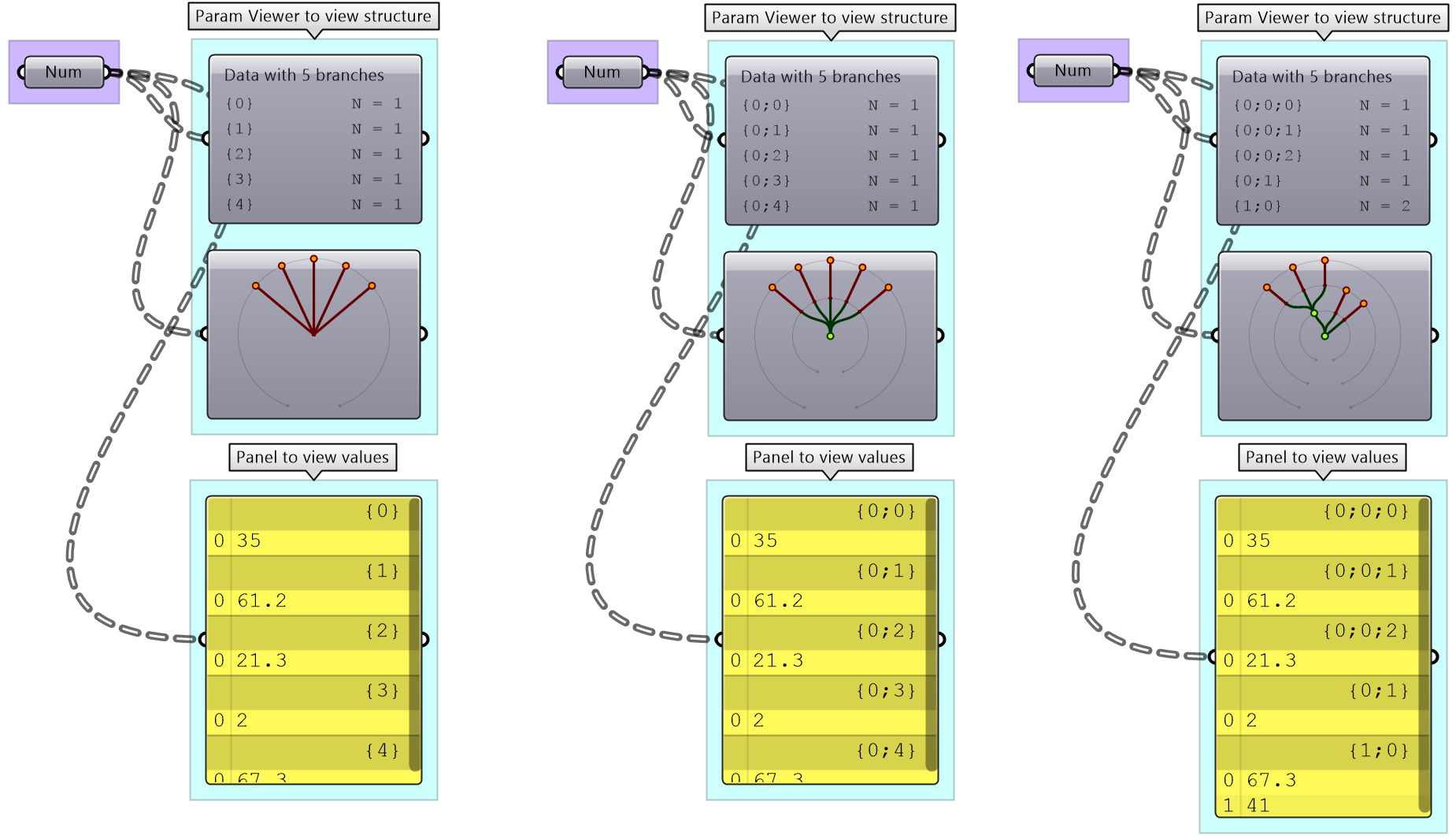 When working with trees, it is of utmost importance to examine the data structure of each input before using it as input to one component. A small change in the structure can have big impact. For example, the following two trees of numbers appear to be matching at first, but because there is one level depth added to one of the trees (indicating an extra branch near the root of the tree), the result may be different than what is intended.