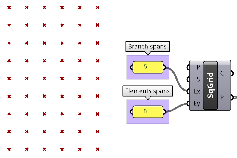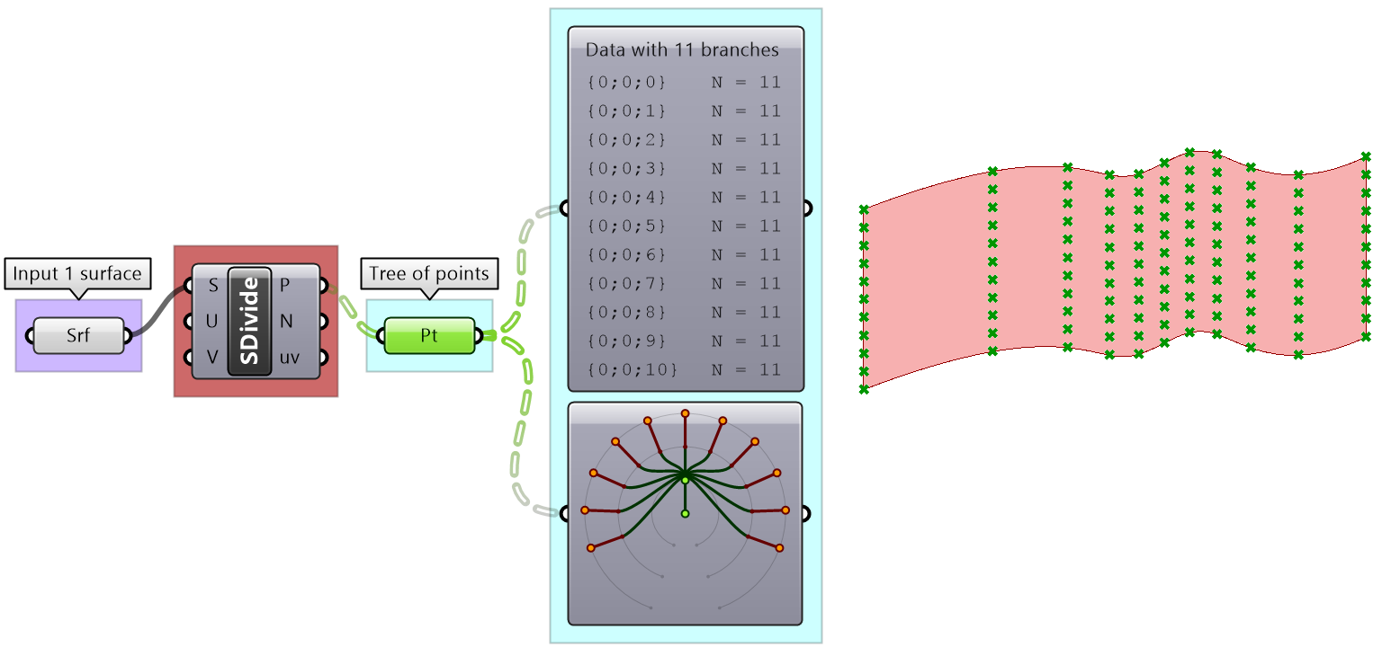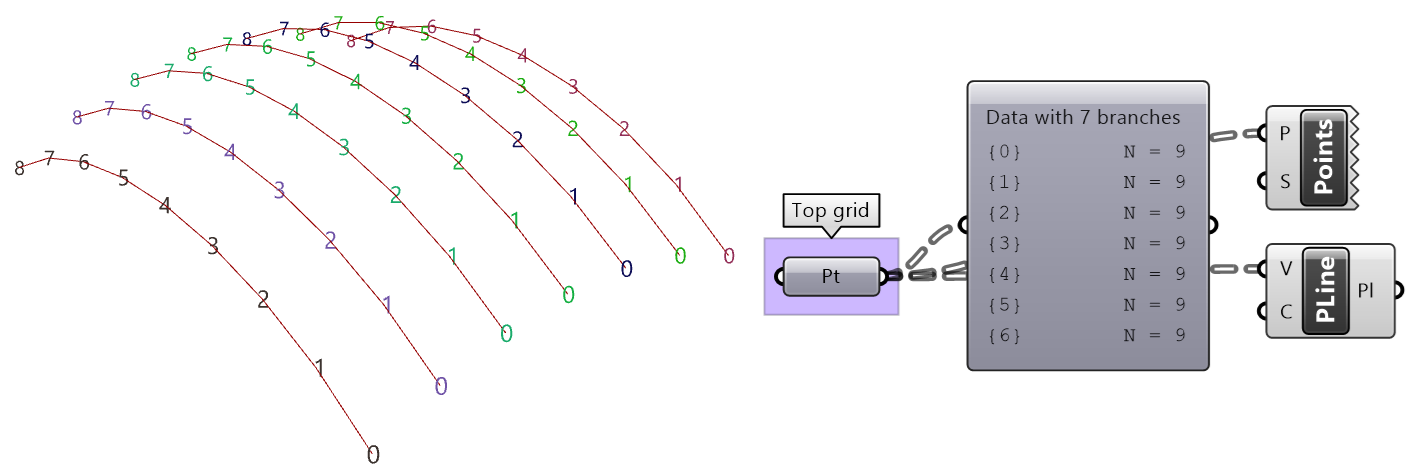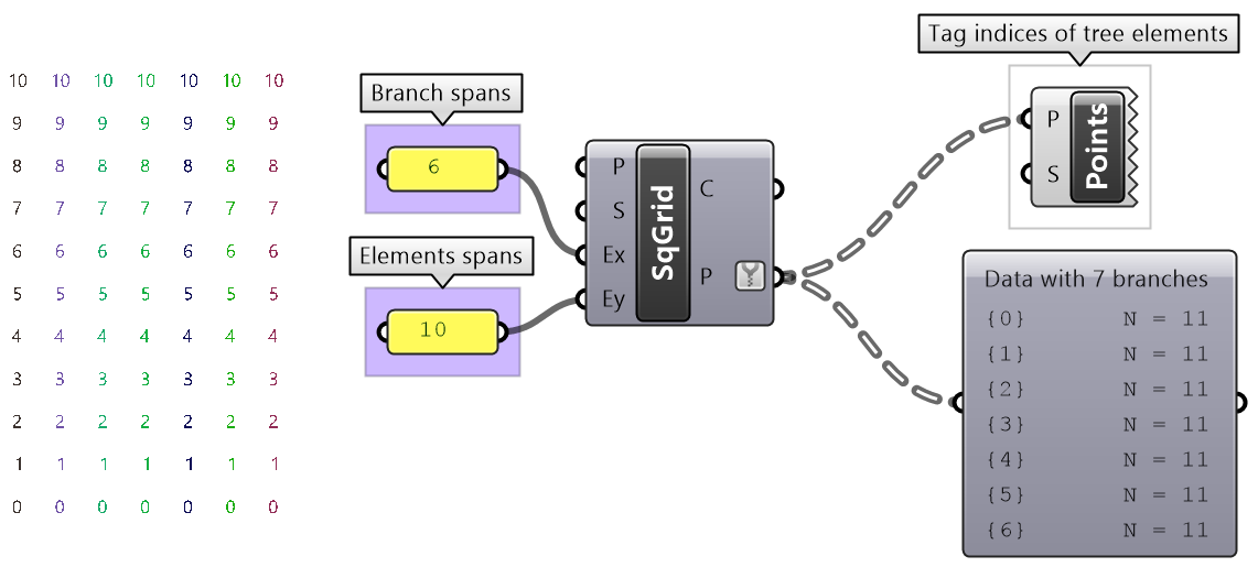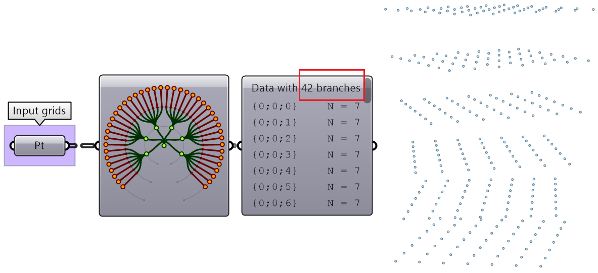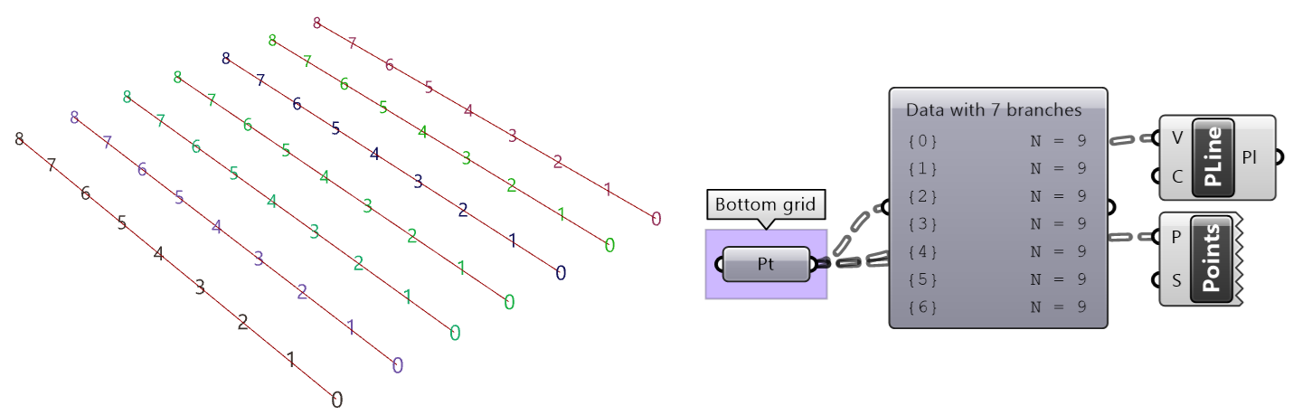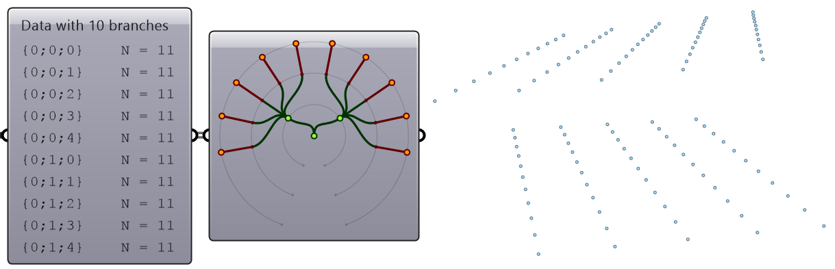 Trees can be thought of as a list of branches. When using list operations on trees, each branch is treated as a separate list and the operation is applied to each branch independently. It is tricky to predict the resulting data structure and therefore it is always important to check your input and output structures before and after applying any operation. To illustrate how list operations work in trees, we will use a simple tree, a grid of points, and apply different list operations on it. We will then examine the output and its data structure.