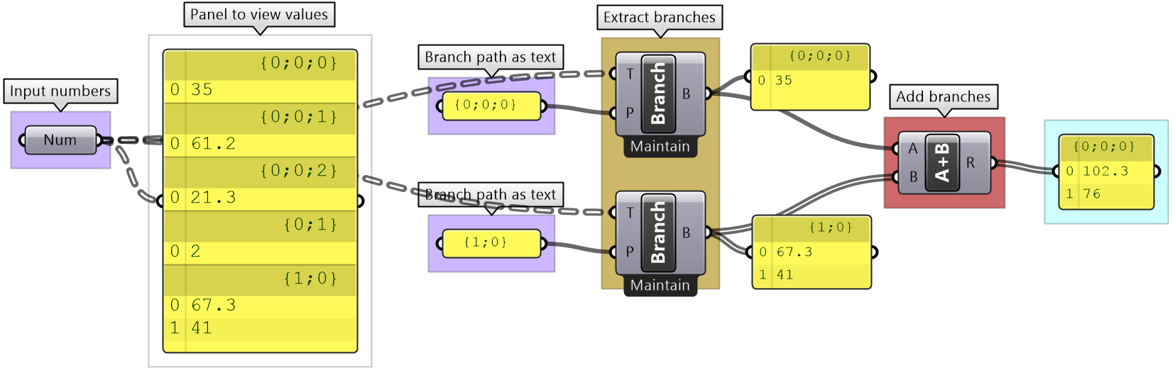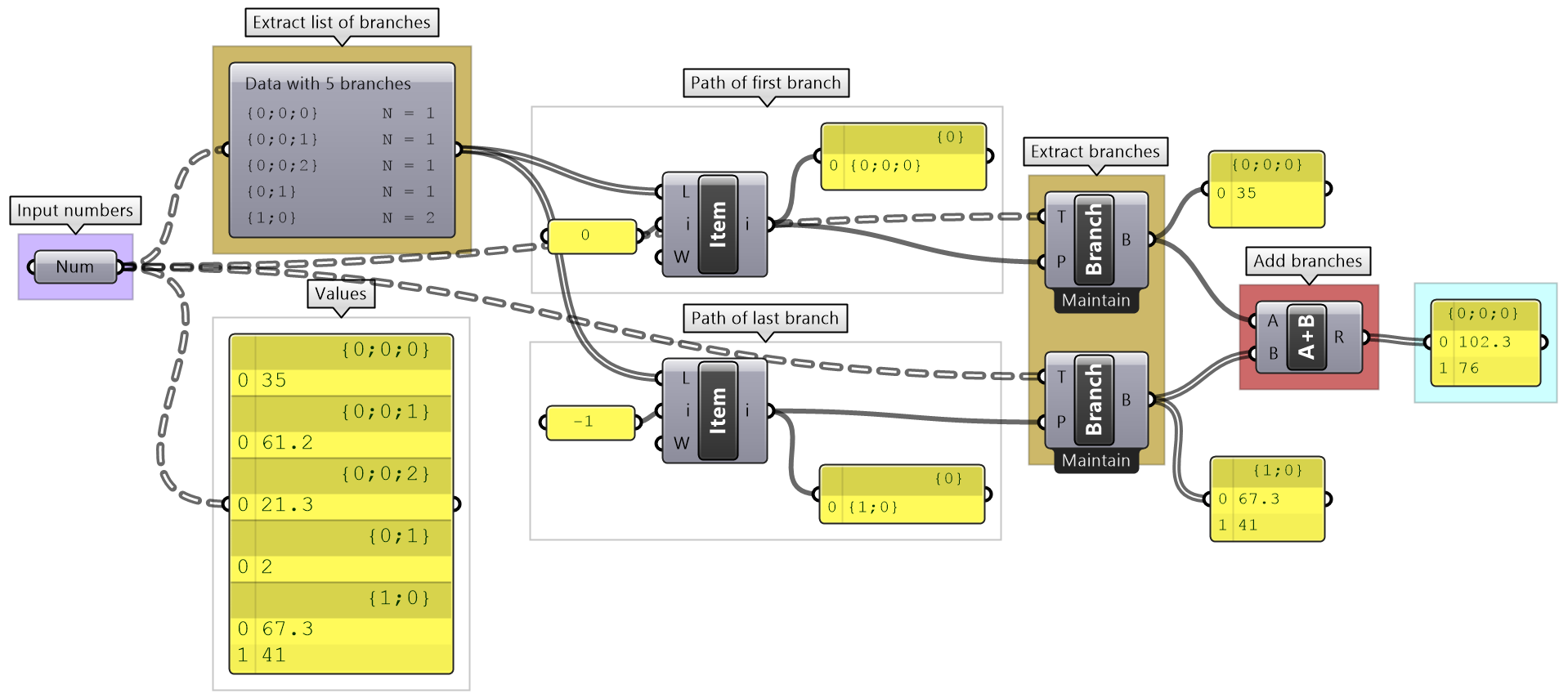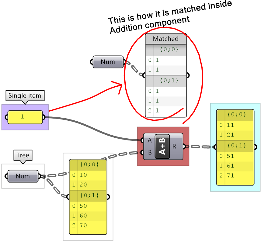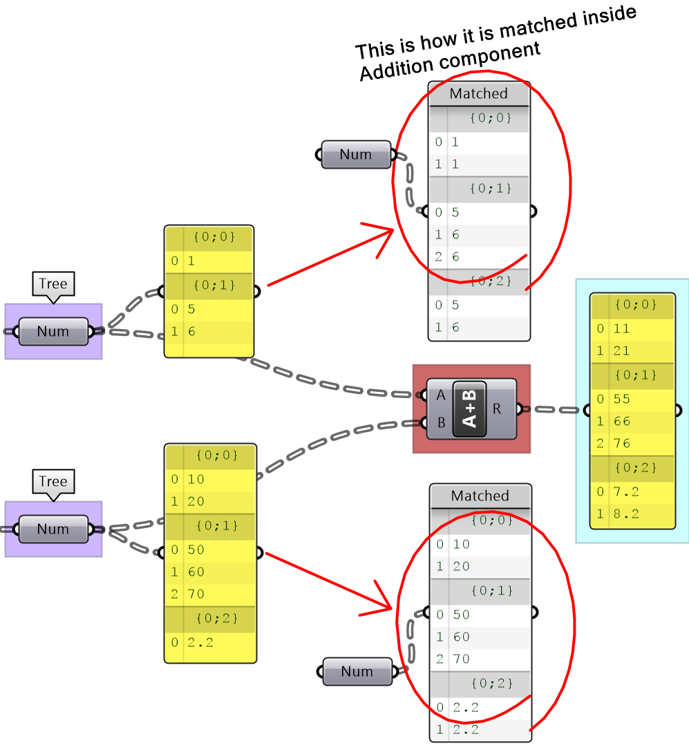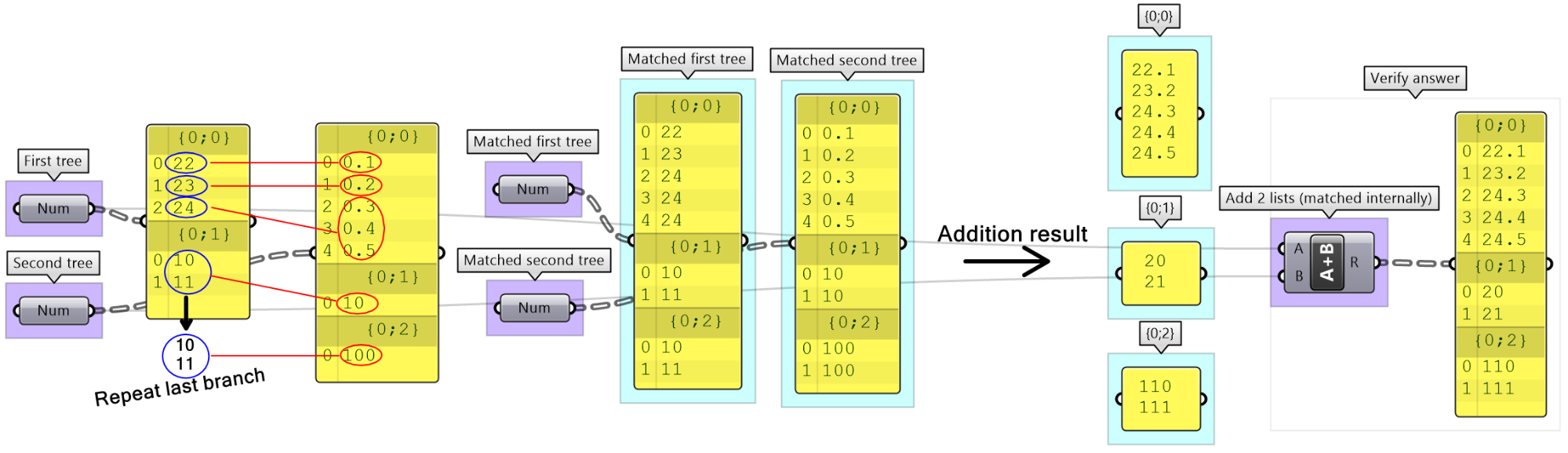 When matching a long list to a tree with branches that are shorter than the list, the tree branches expand to match the length of the list. The last item in each branch is repeated to match the list length Note that the resulting tree structure will be differenent than the input tree. In the following example, both input, the list and the tree, are modified to arrive to a matching structure, then the addition result have than new data structure.
