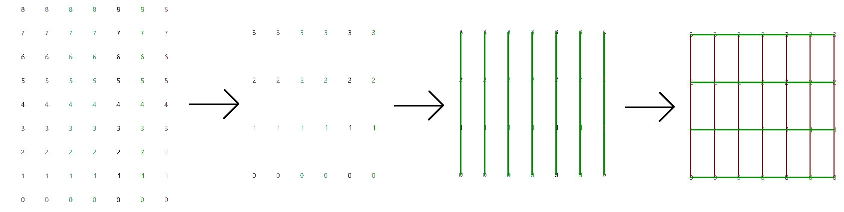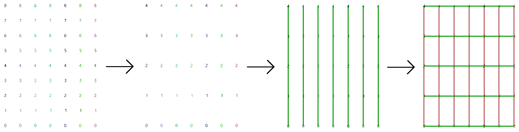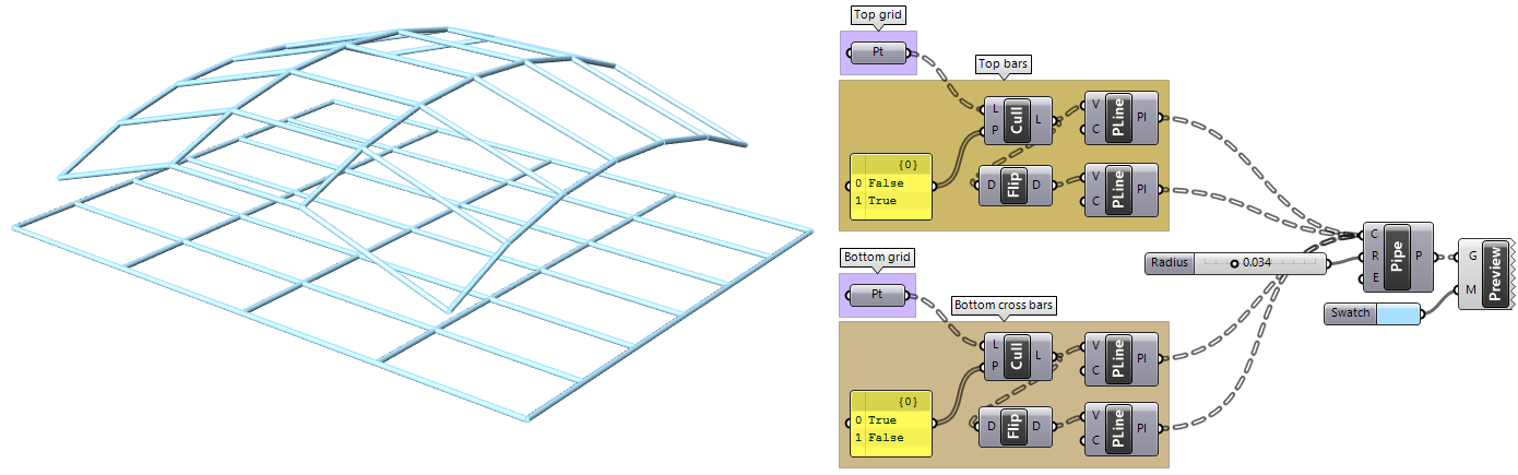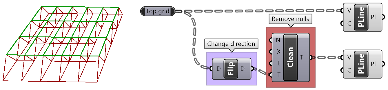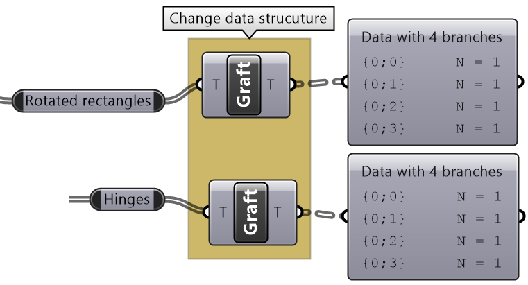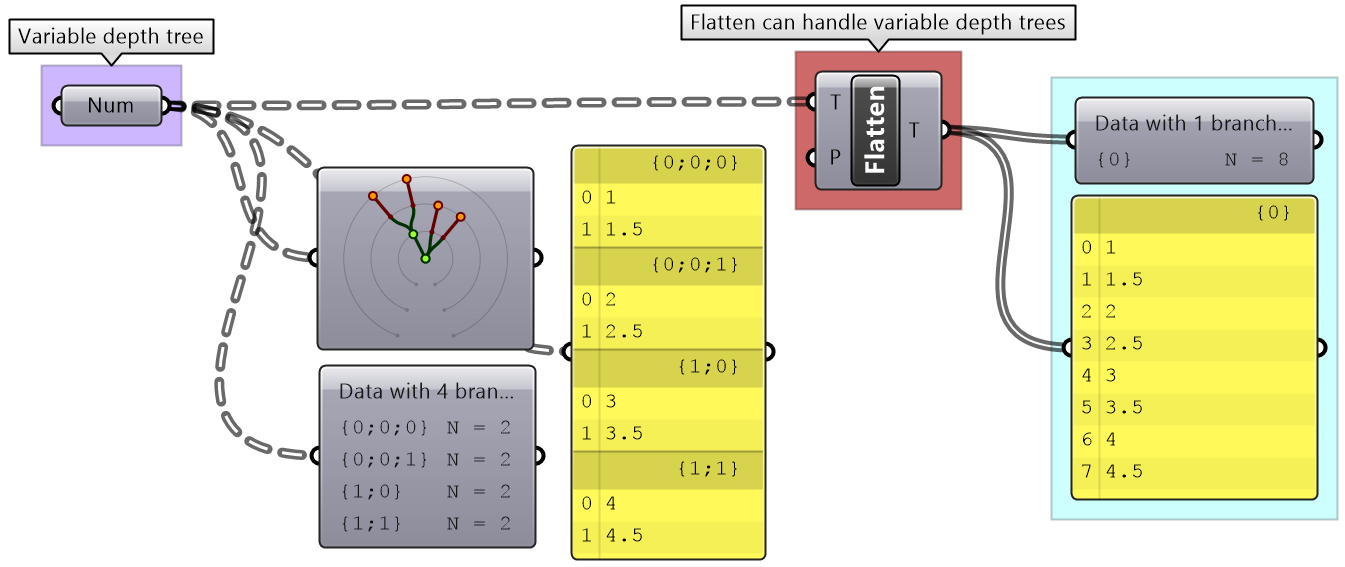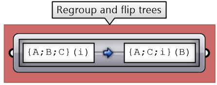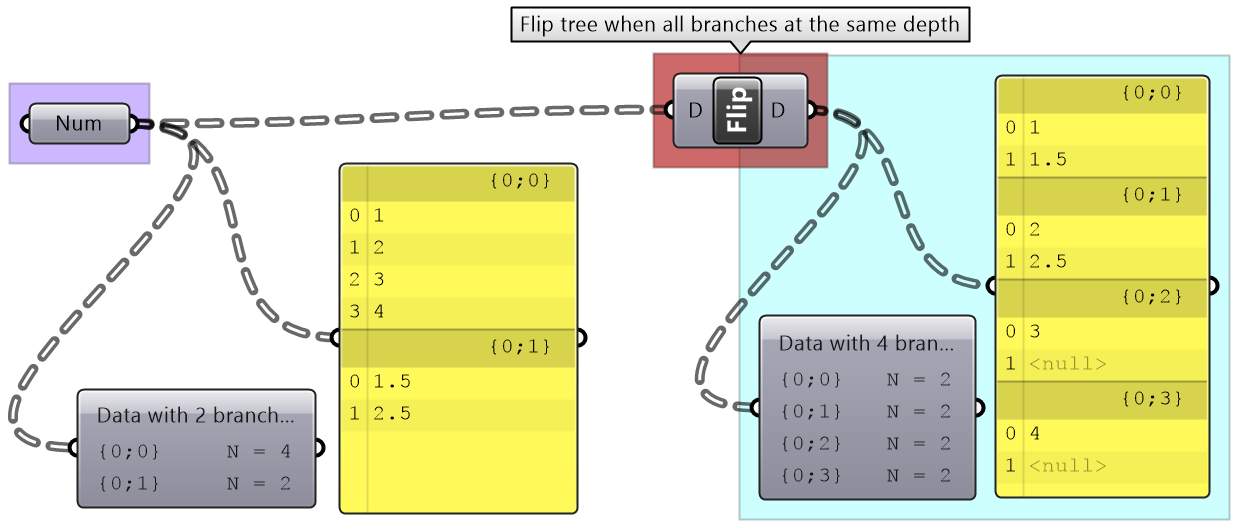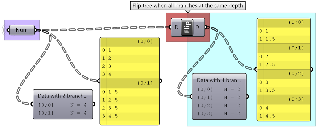 It is logical in some cases to flip the tree to change the direction of branches.This is specially useful in grids when points are organized in rows and columns (similar to a 2 dimensional array structure). Flipping causes corresponding elements across branches (have the same index in their branch) to be grouped in one branch. For example, a data tree that has 2 branches and 4 items in each branch, can be flipped into a tree with 4 branches and 2 elements in each branch.