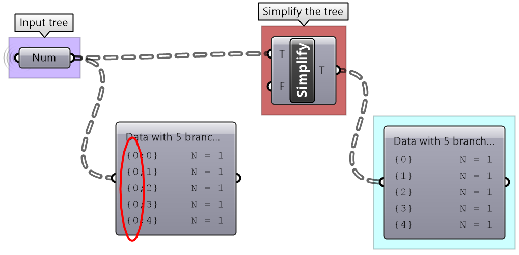 Processing data through multiple components can add unnecessary complexity to the data structure. The most common form is adding leading or trailing zeros to the paths addresses. Complex data structures are hard to match. Simplify Tree process helps remove empty branches. There are other operations such as Clean Tree and Trim Tree to help remove null elements, empty branches and reduce complexity. It is also possible to extract all branches as separate lists using the Explode Tree operation.
