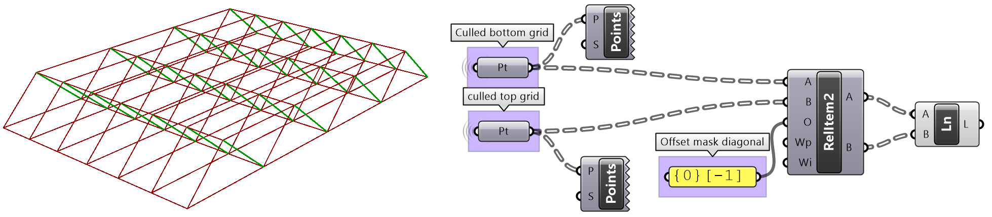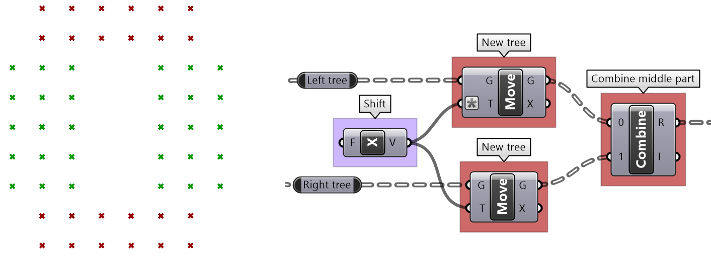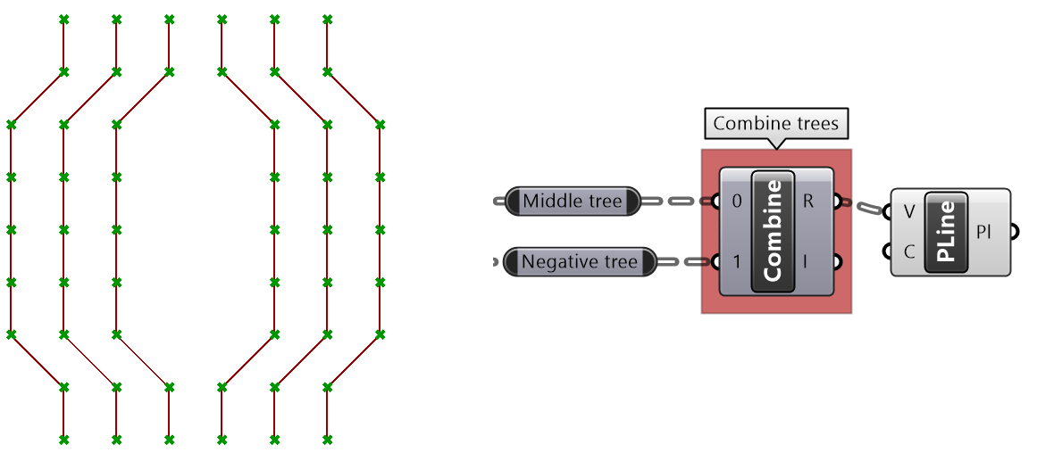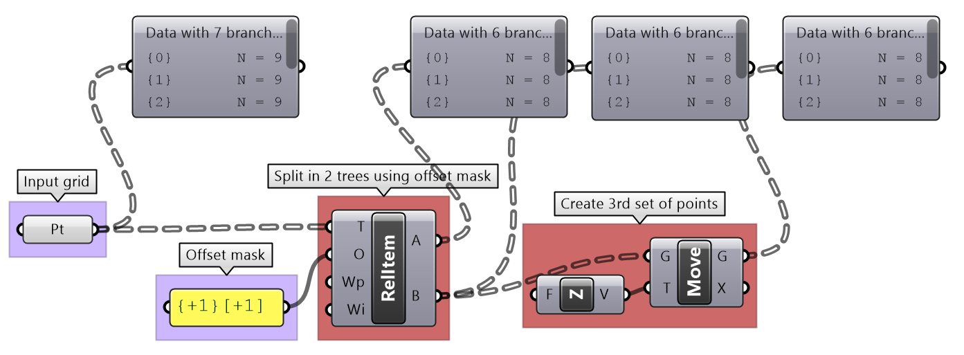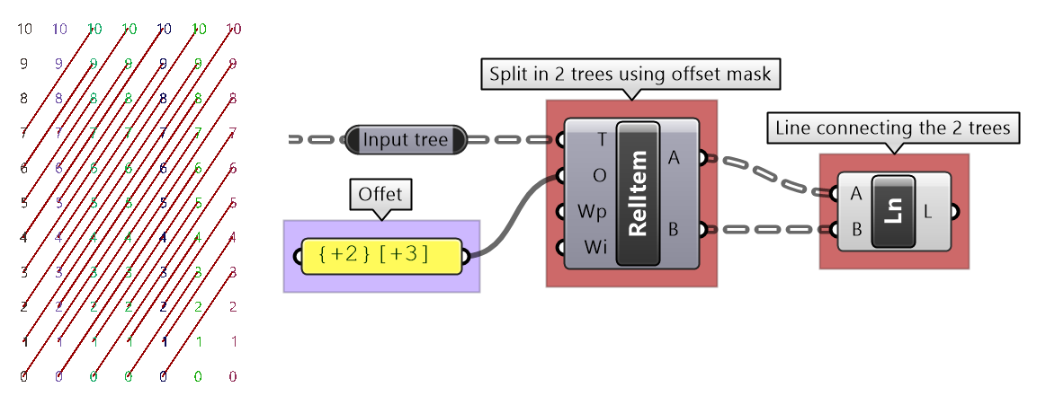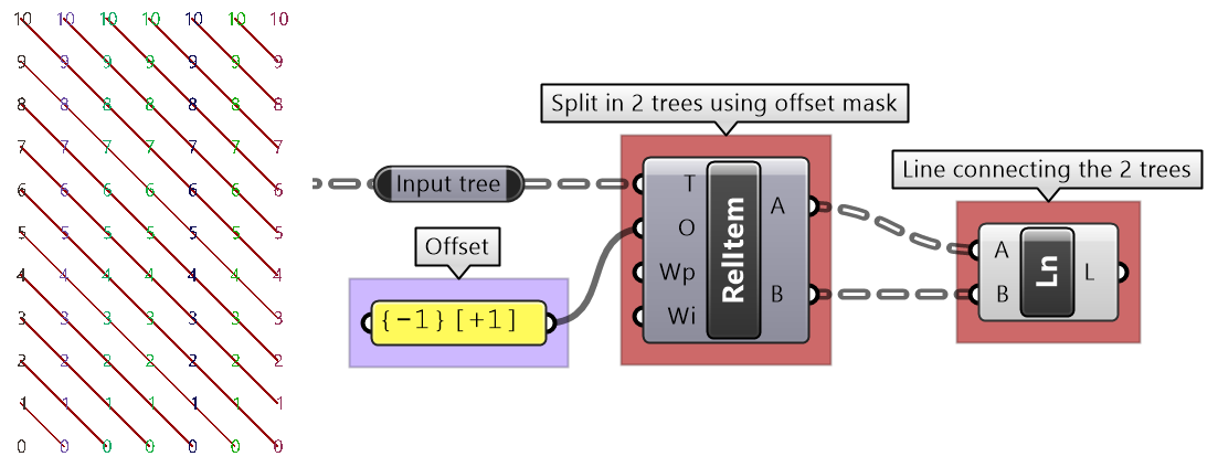 We showed how to define relative items in one tree, but you can also specify relative items between 2 trees. You’ll need to pay attention to the data structure of the two input trees and make sure they are compatible. For example, if you connect each point from the first tree with another point from a different tree with the same index, but +1 branch, then you can set the offset string to be {+1}[0].
