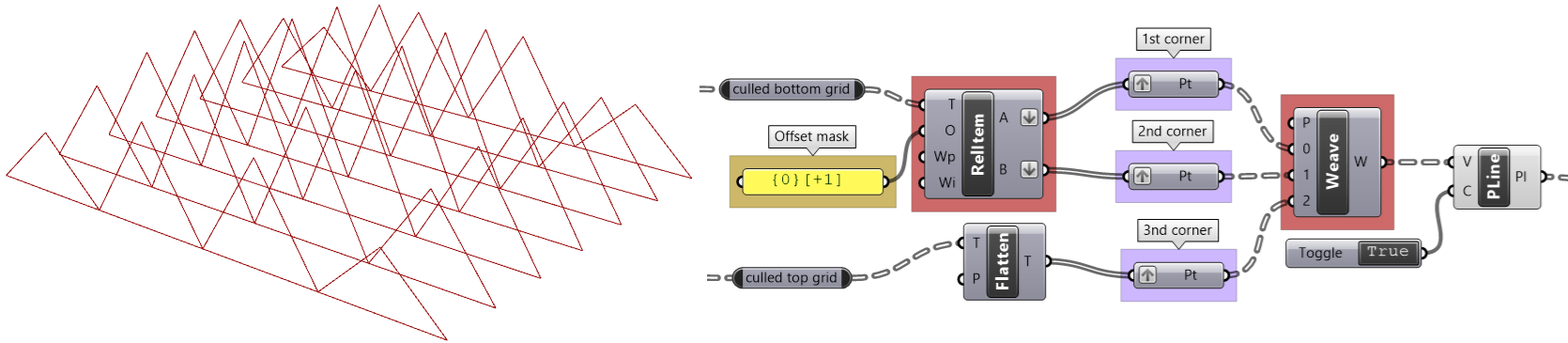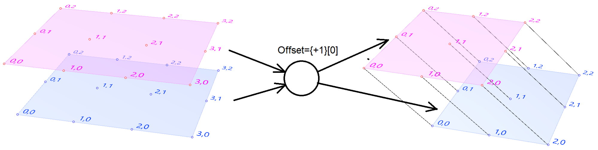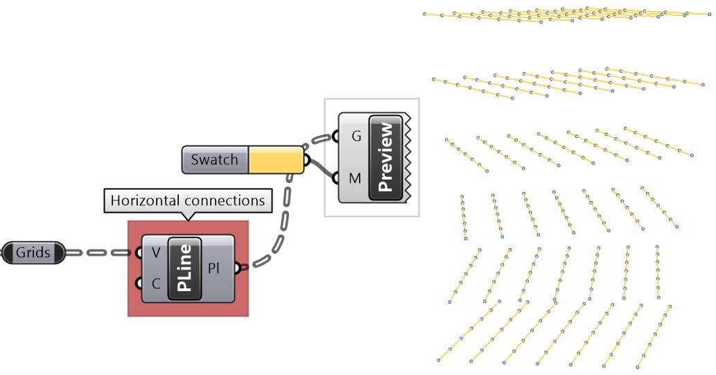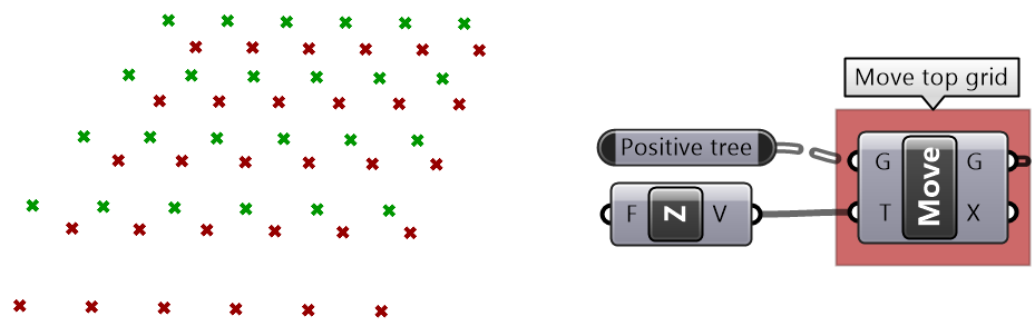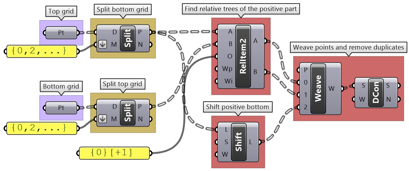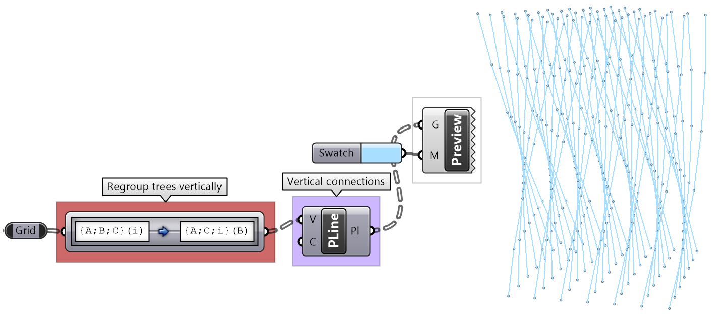 We showed how to define relative items in one tree, but you can also specify relative items between 2 trees. You’ll need to pay attention to the data structure of the two input trees and make sure they are compatible. For example, if you connect each point from the first tree with another point from a different tree with the same index, but +1 branch, then you can set the offset string to be {+1}[0].