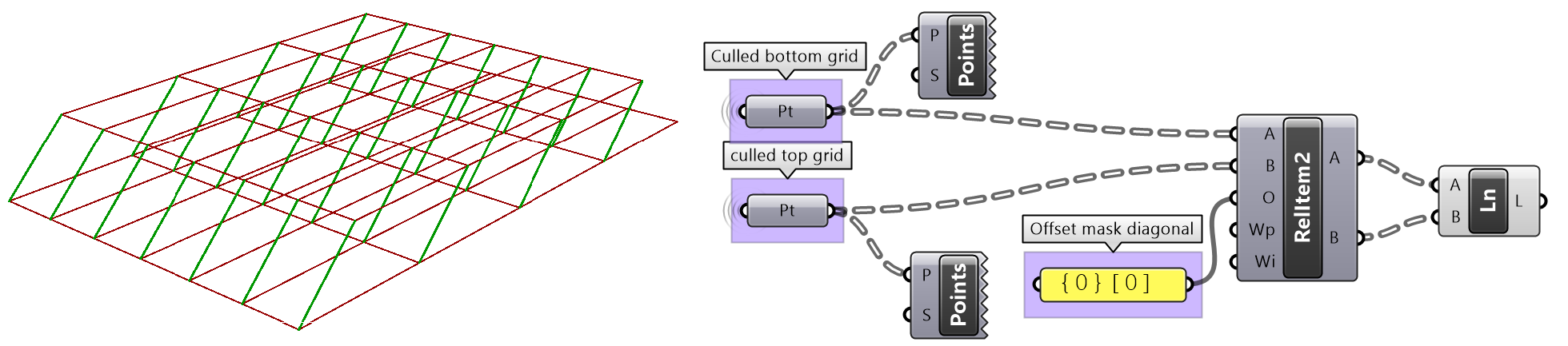 In Grasshopper, the way you communicate the offset is expressed with an offset string in the format “{branch offset}[index offset]”. In our example, the string to connect points diagonally is “{+1}[+1]”. Here is an example that uses relative tree component in Grasshopper. Notice that the relative item component creates two new trees that correlate in the manner specified in the offset string.
