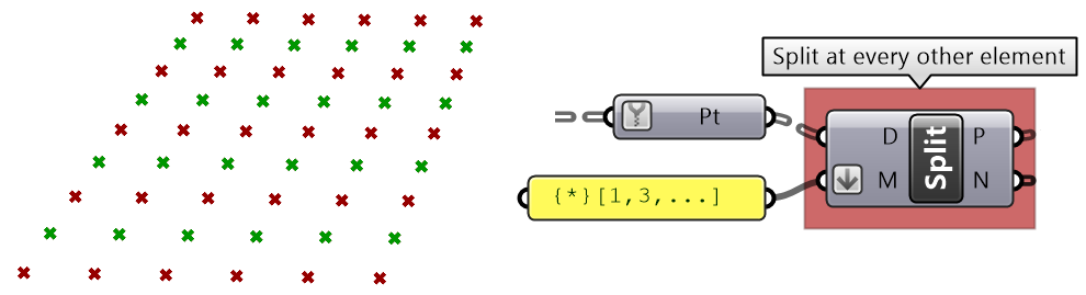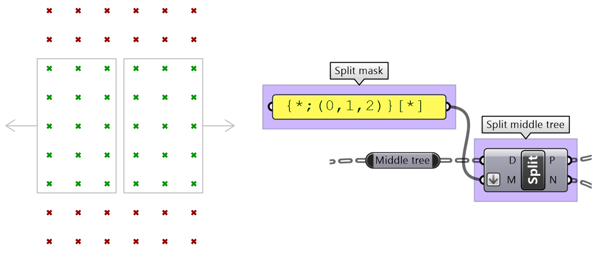 The ability to select a portion of a tree, or split into two parts is a very powerful tree operation in Grasshopper. You can split the tree using a string mask using specific syntax (see examples below). The mask filters, or helps select, the positive part of your tree. The portion of the tree left, is also given as an output and is called the negative part of the tree. Since all trees are made out of branches and indices, the split mask should include information about which branches and indices within these branches to split along. Here are the rules of the split mask: