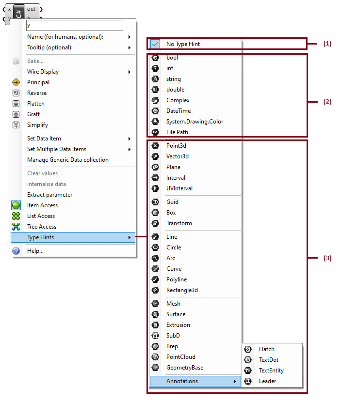 - No Type Hint. if you do not specify the input type, GH assigns the base type System.Object. The System.Object is the root type that all other types are built on. Therefore, it is safe to assign System.Object type to any data type.