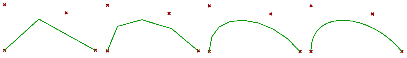 The De Casteljau algorithm to draw a Bezier curve with 2, 4, 8, and 16 segments