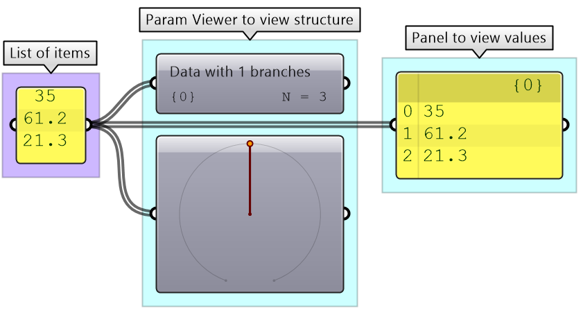 As we have seen in the data matching, different data structures of the same set of elements produce different results. Grasshopper offers three ways to view the data structure, the Parameter Viewer in text or diagram format, and the Panel.
