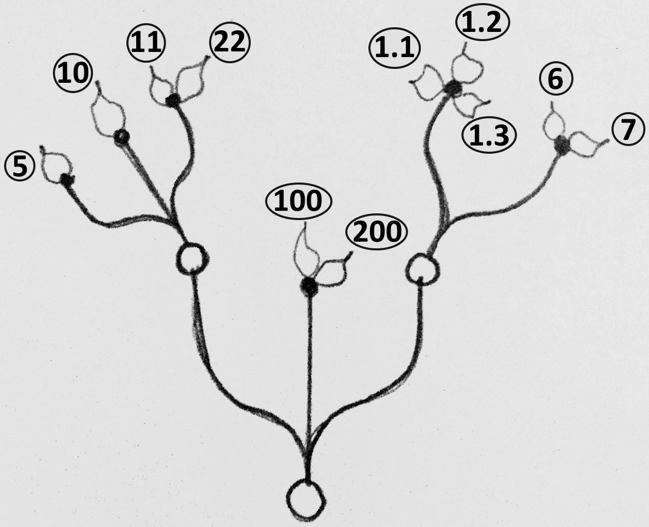A list of items is typically stored in a tree with one branch. Figure (53). However, the three items can also be stored in three different branches. Figure (54).