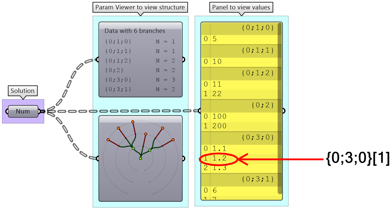 The first step to understanding data trees is to learn the GH notation of trees. As we have seen from the examples, trees consist of branches, and each branch holds a number of elements. The address or path of each branch is represented with integers separated by semicolons and enclosed in curly brackets. The index of each element is enclosed by square brackets. This diagram shows a breakdown of the address of elements in trees.