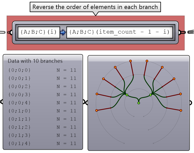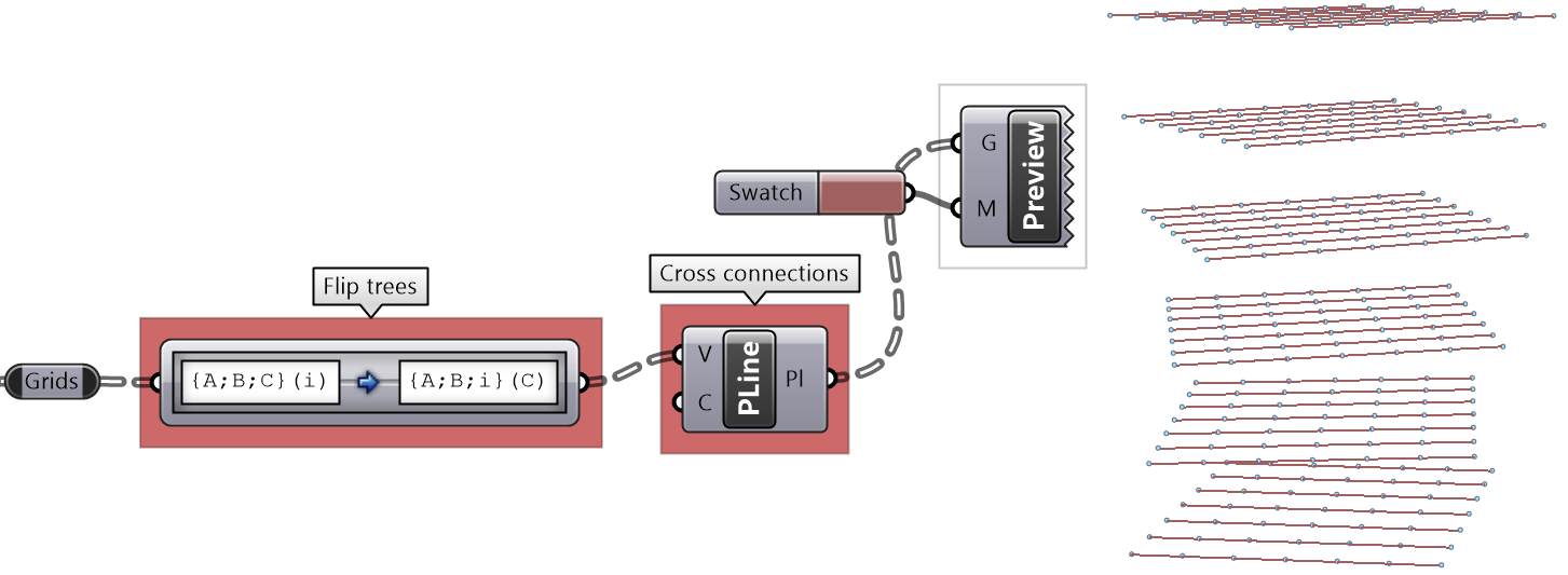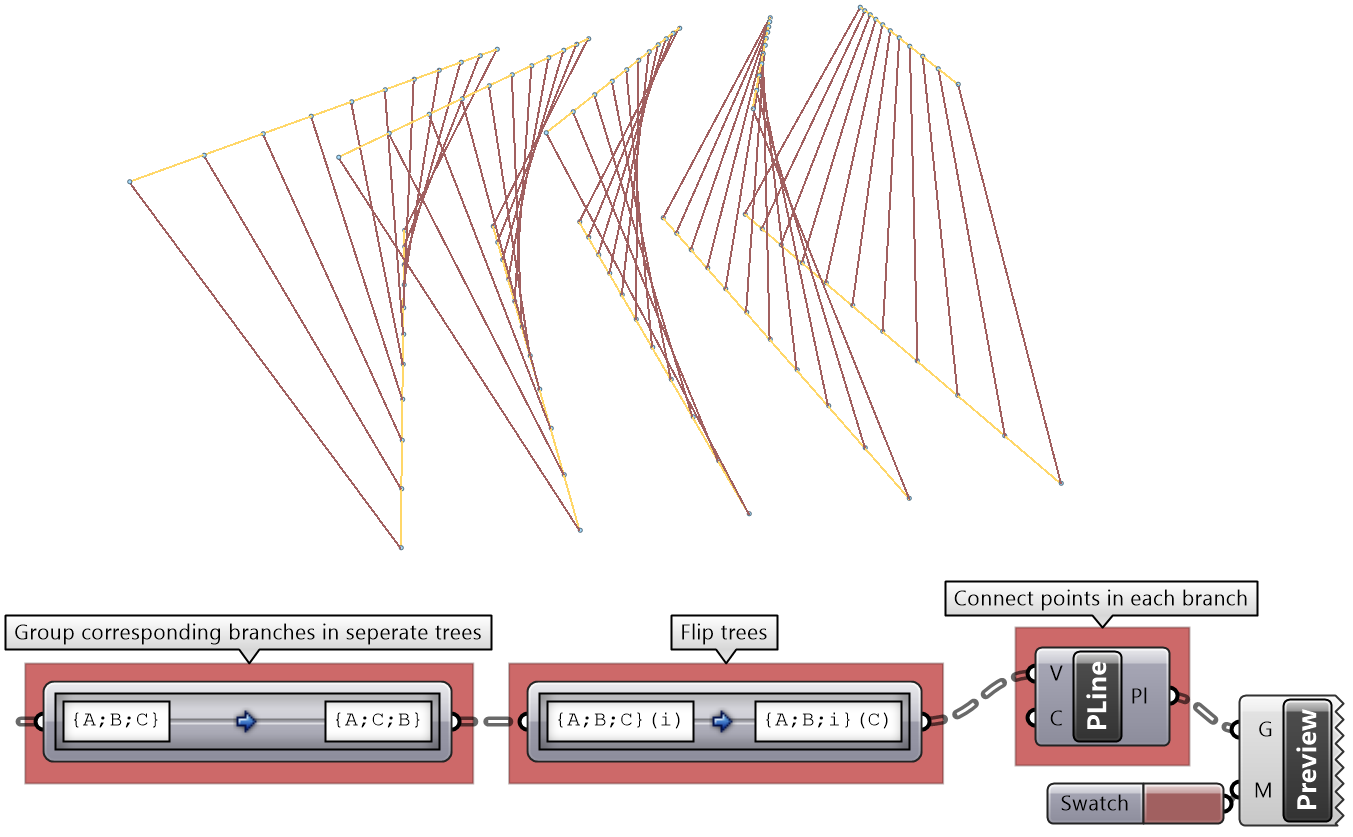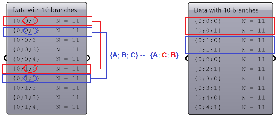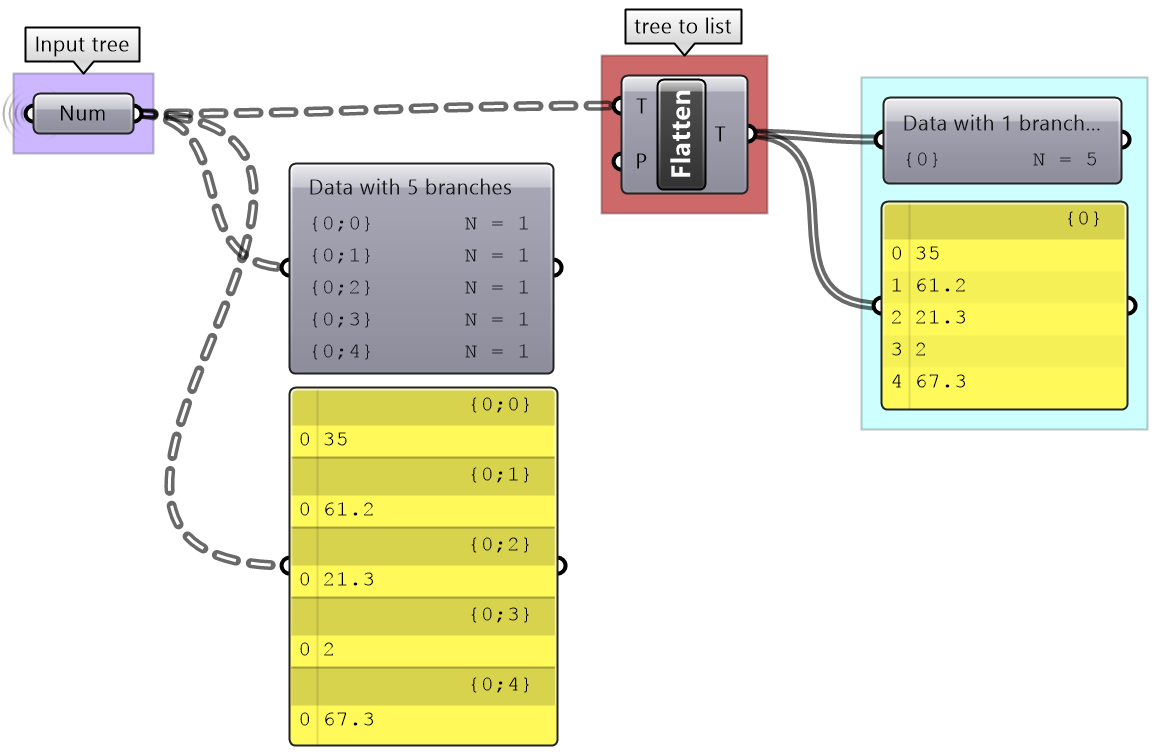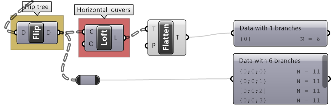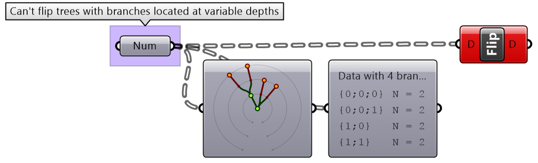 It is logical in some cases to flip the tree to change the direction of branches.This is specially useful in grids when points are organized in rows and columns (similar to a 2 dimensional array structure). Flipping causes corresponding elements across branches (have the same index in their branch) to be grouped in one branch. For example, a data tree that has 2 branches and 4 items in each branch, can be flipped into a tree with 4 branches and 2 elements in each branch.