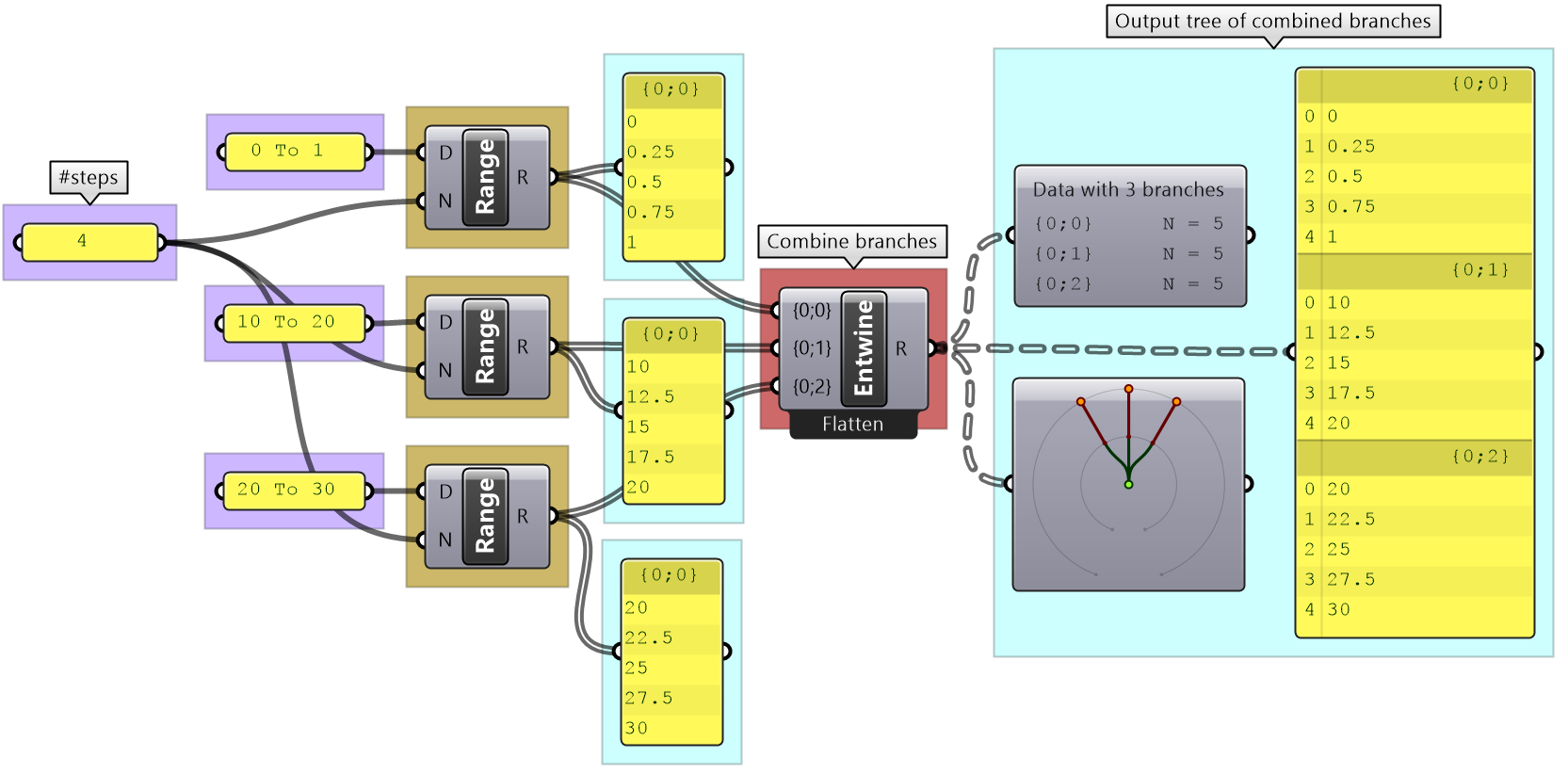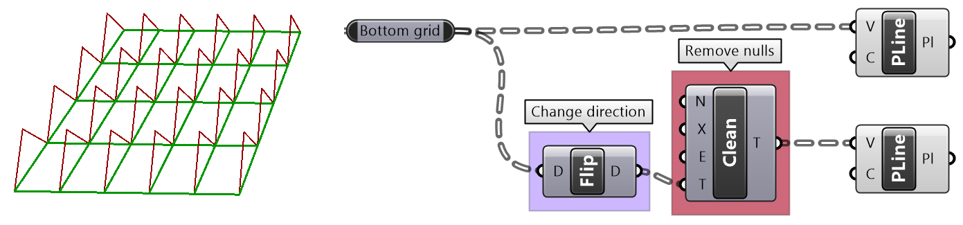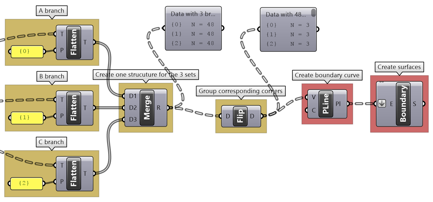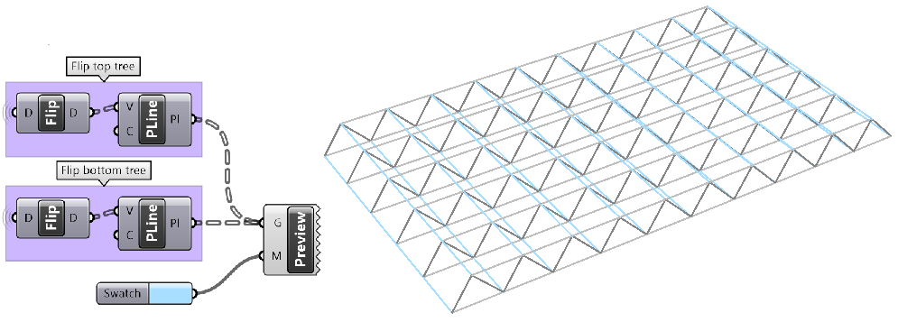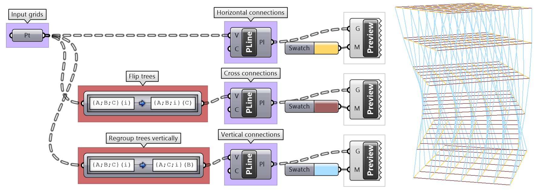 It is logical in some cases to flip the tree to change the direction of branches.This is specially useful in grids when points are organized in rows and columns (similar to a 2 dimensional array structure). Flipping causes corresponding elements across branches (have the same index in their branch) to be grouped in one branch. For example, a data tree that has 2 branches and 4 items in each branch, can be flipped into a tree with 4 branches and 2 elements in each branch.