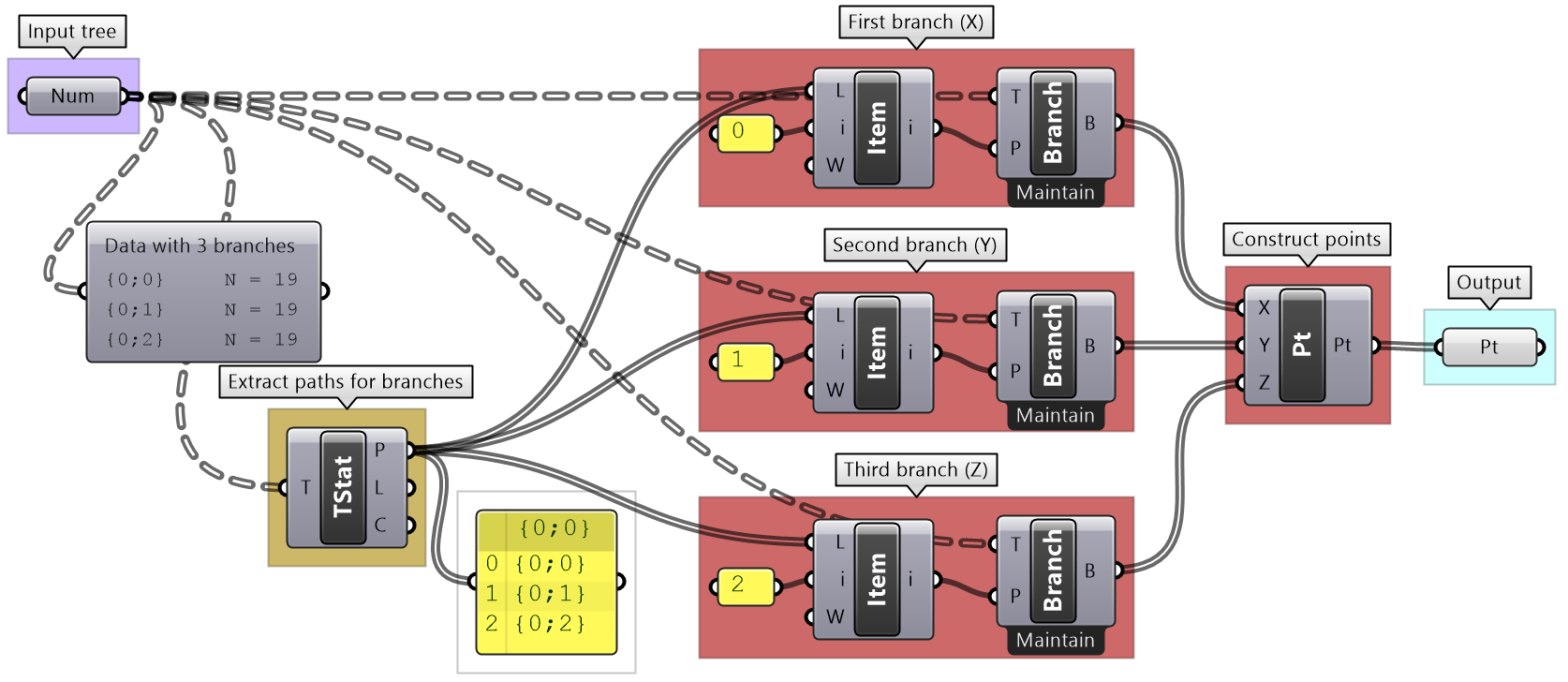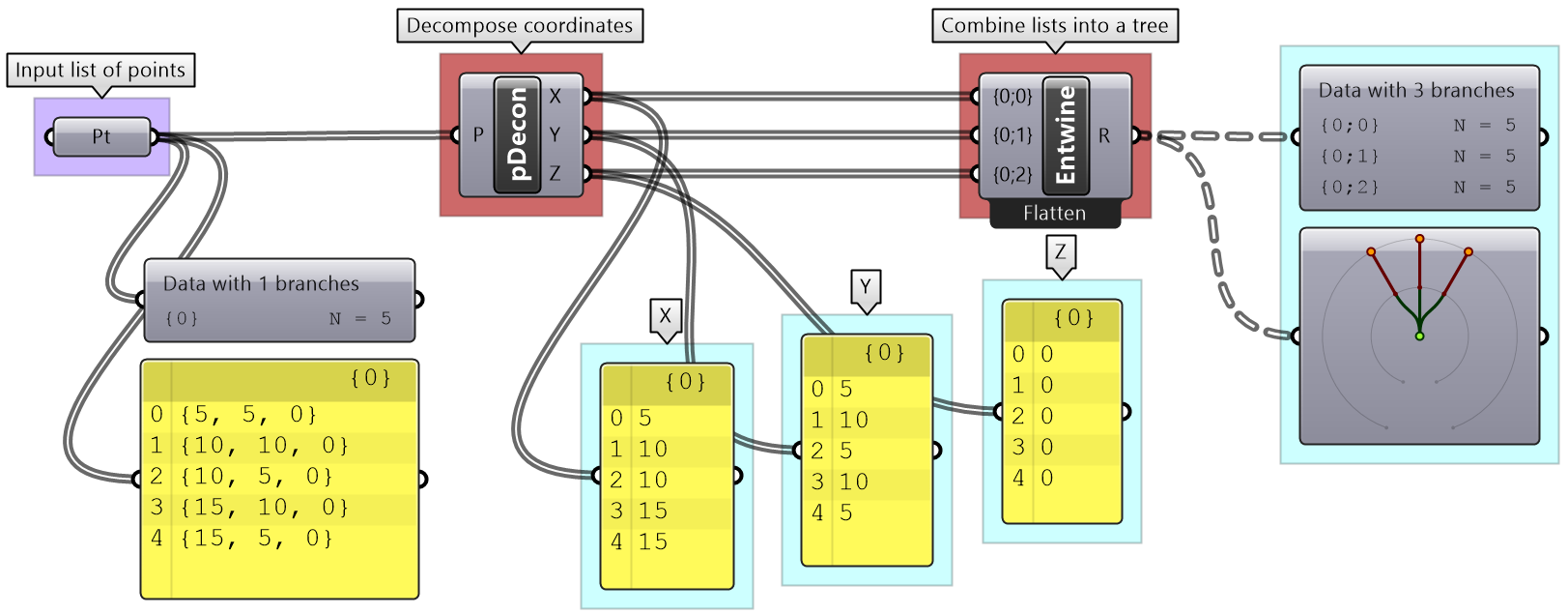 Solution...Each input point is a single data item that contains 3 numbers (coordinates). We know we would like to isolate each coordinate into a separate list, then combine them into one data structure. Hence we need to first deconstruct input points (use Deconstruct of pDecon component), then combine the lists into one structure (use Entwine component). ![]() |