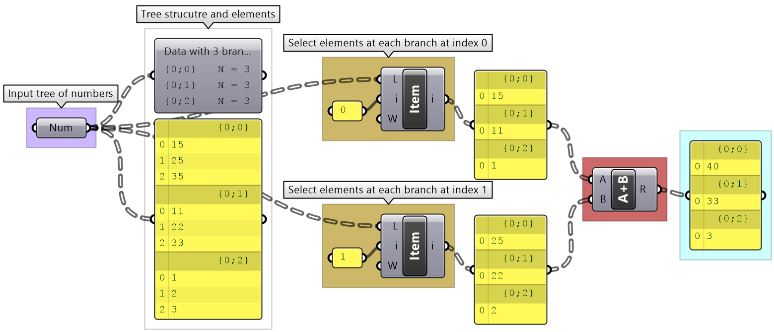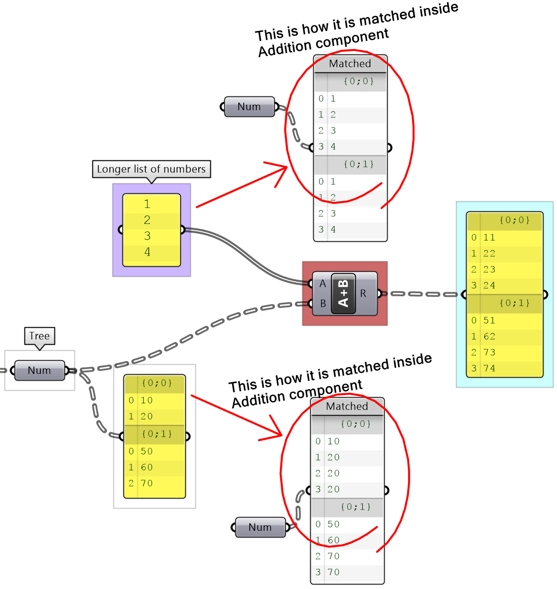 When matching a long list to a tree with branches that are shorter than the list, the tree branches expand to match the length of the list. The last item in each branch is repeated to match the list length Note that the resulting tree structure will be differenent than the input tree. In the following example, both input, the list and the tree, are modified to arrive to a matching structure, then the addition result have than new data structure.