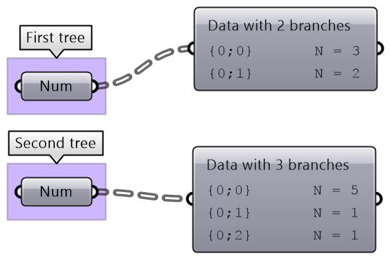 When working with trees, it is of utmost importance to examine the data structure of each input before using it as input to one component. A small change in the structure can have big impact. For example, the following two trees of numbers appear to be matching at first, but because there is one level depth added to one of the trees (indicating an extra branch near the root of the tree), the result may be different than what is intended.