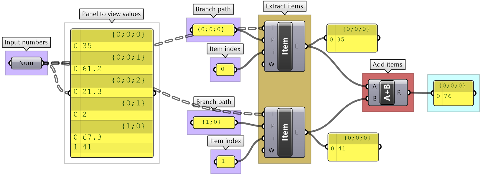 Inspect the following 2 number structures, then predict the structure and result of adding them (with default Grasshopper matching). Verify your answer using the Addition components.![]() |