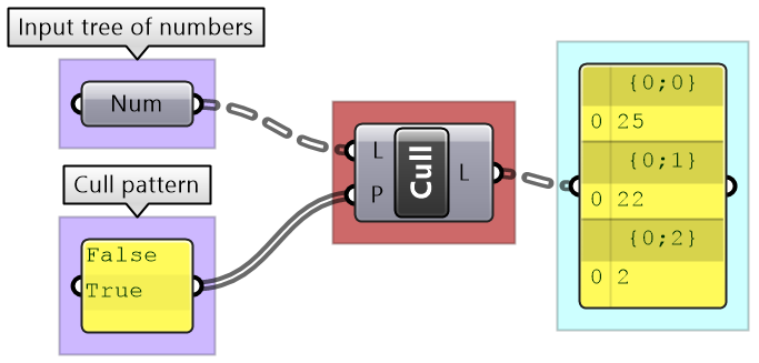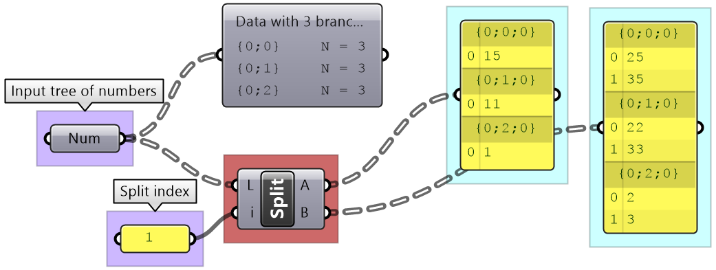 The ability to select a portion of a tree, or split into two parts is a very powerful tree operation in Grasshopper. You can split the tree using a string mask using specific syntax (see examples below). The mask filters, or helps select, the positive part of your tree. The portion of the tree left, is also given as an output and is called the negative part of the tree. Since all trees are made out of branches and indices, the split mask should include information about which branches and indices within these branches to split along. Here are the rules of the split mask: