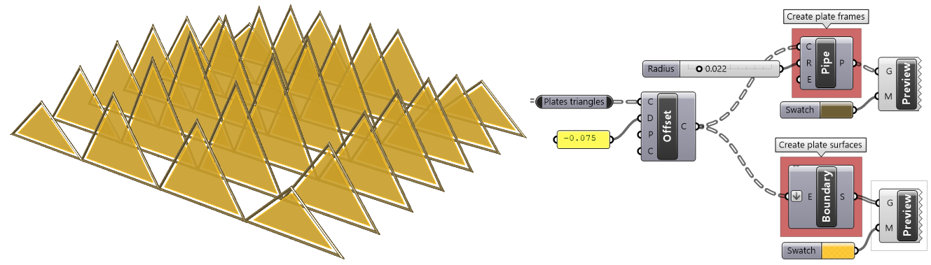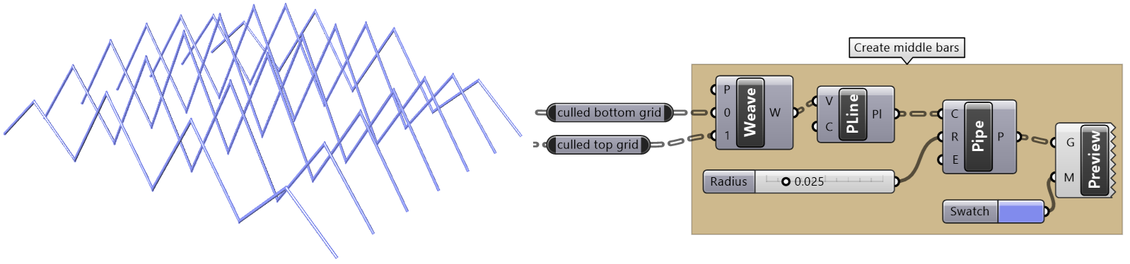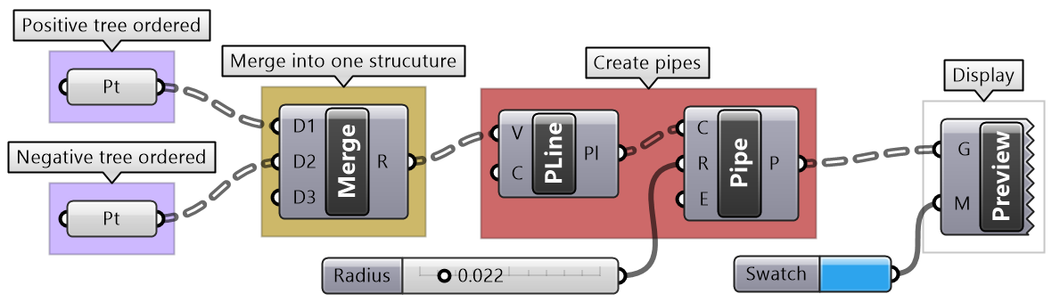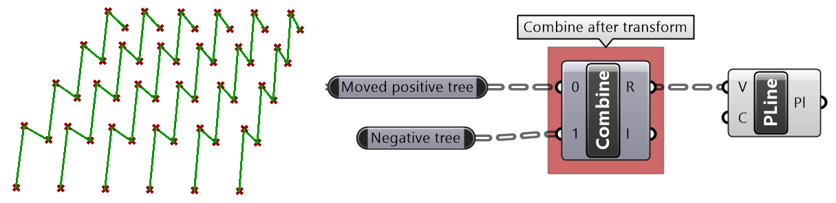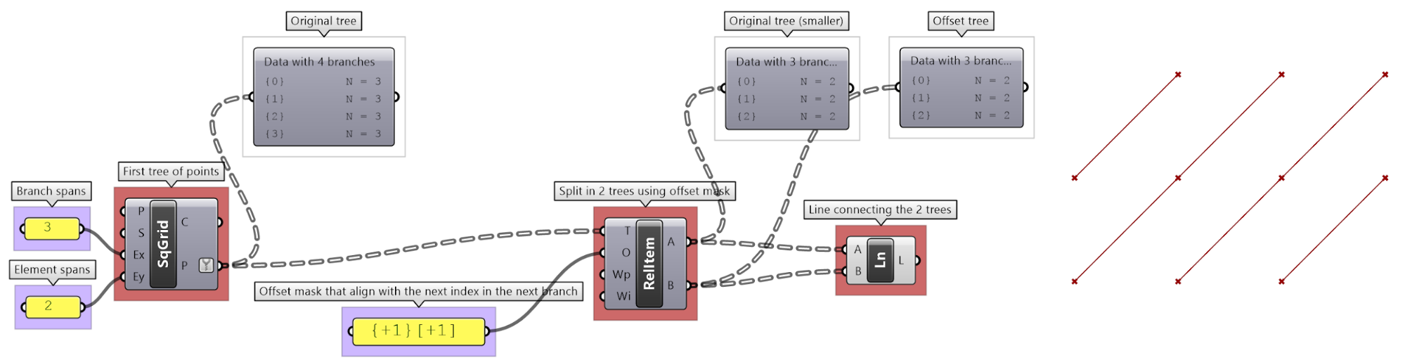 We showed how to define relative items in one tree, but you can also specify relative items between 2 trees. You’ll need to pay attention to the data structure of the two input trees and make sure they are compatible. For example, if you connect each point from the first tree with another point from a different tree with the same index, but +1 branch, then you can set the offset string to be {+1}[0].