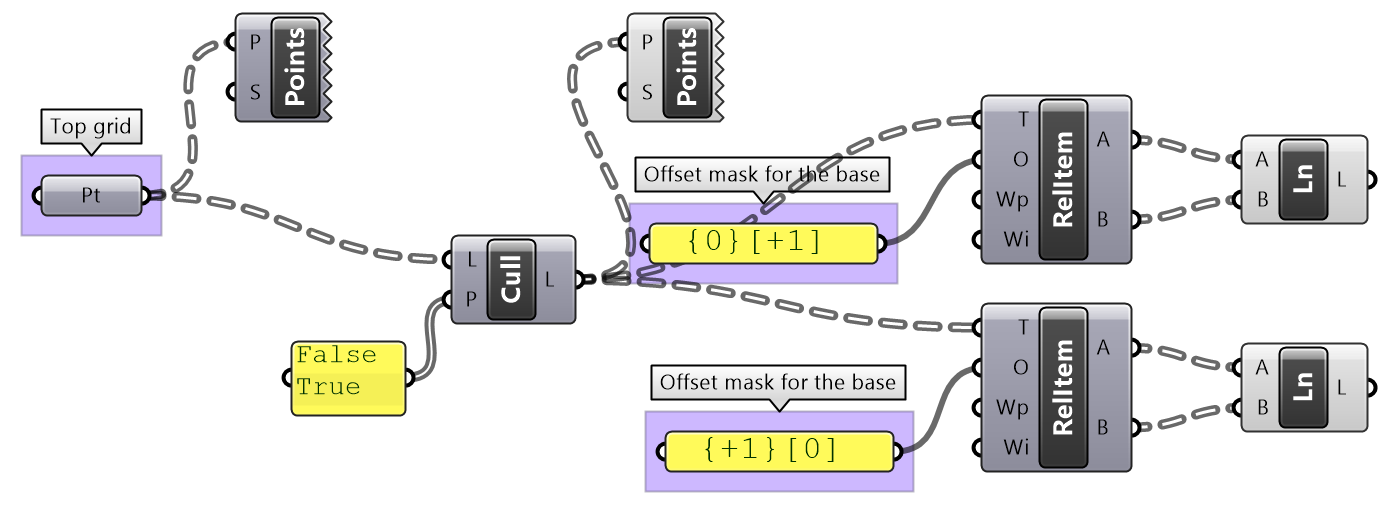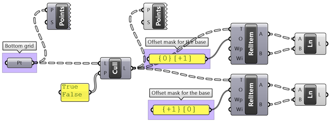 In Grasshopper, the way you communicate the offset is expressed with an offset string in the format “{branch offset}[index offset]”. In our example, the string to connect points diagonally is “{+1}[+1]”. Here is an example that uses relative tree component in Grasshopper. Notice that the relative item component creates two new trees that correlate in the manner specified in the offset string.