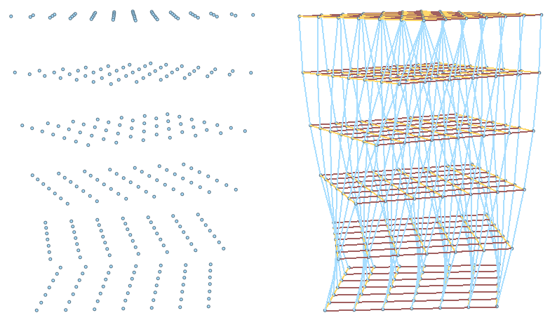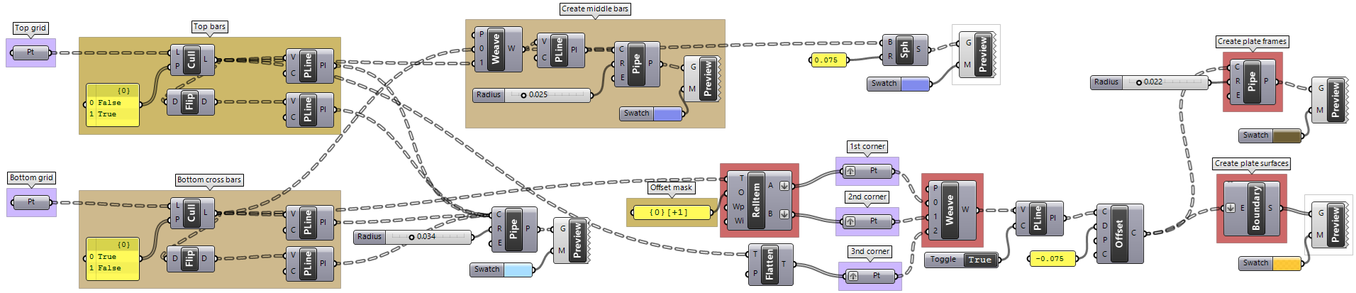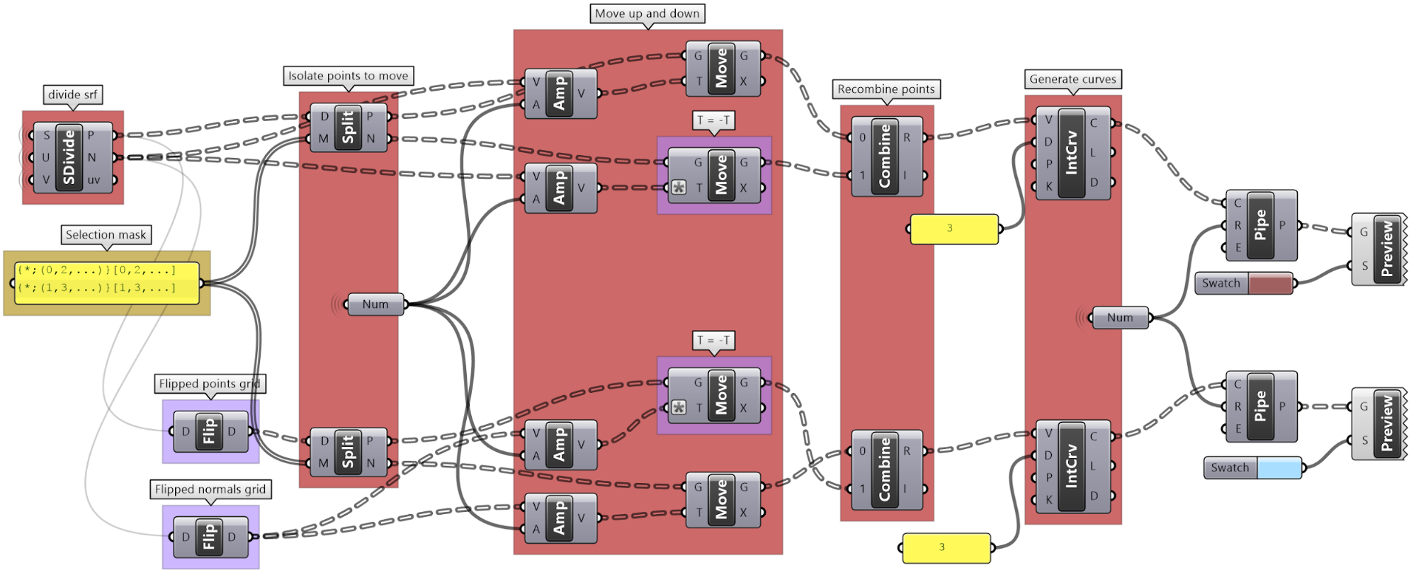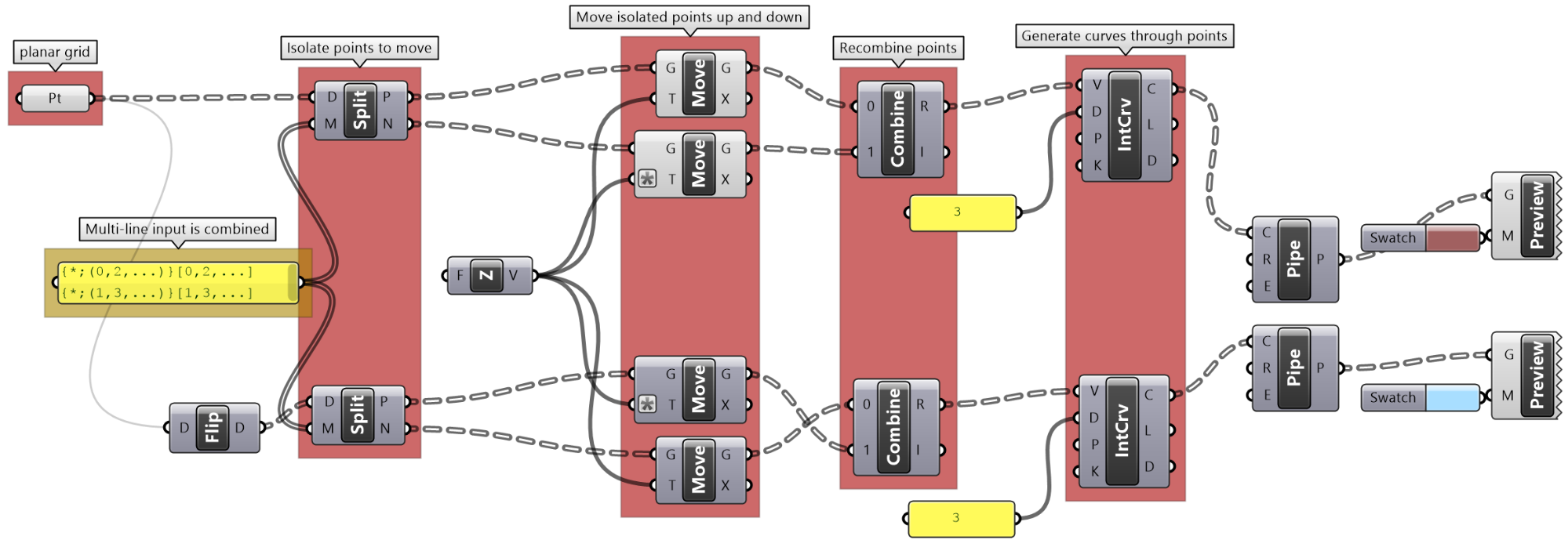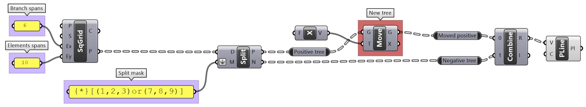One of the common applications that uses split tree functionality is when you have a grid of points that you like to transform a subset of. When splitting, the structure of the original tree is preserved, and the elements that are split out are replaced with null. Therefore, when applying transformation to the split tree, it is easy to recombine back. Suppose you have a grid with 7 branches and 11 elements in each branch, and you’d like to shift elements between indices 1-3 and 7-9. You can use the split tree to help isolate the points you need to move using the mask: {*}[ (1,2,3) or (7,8,9) ], move the positive tree, then recombine back with the negative tree.