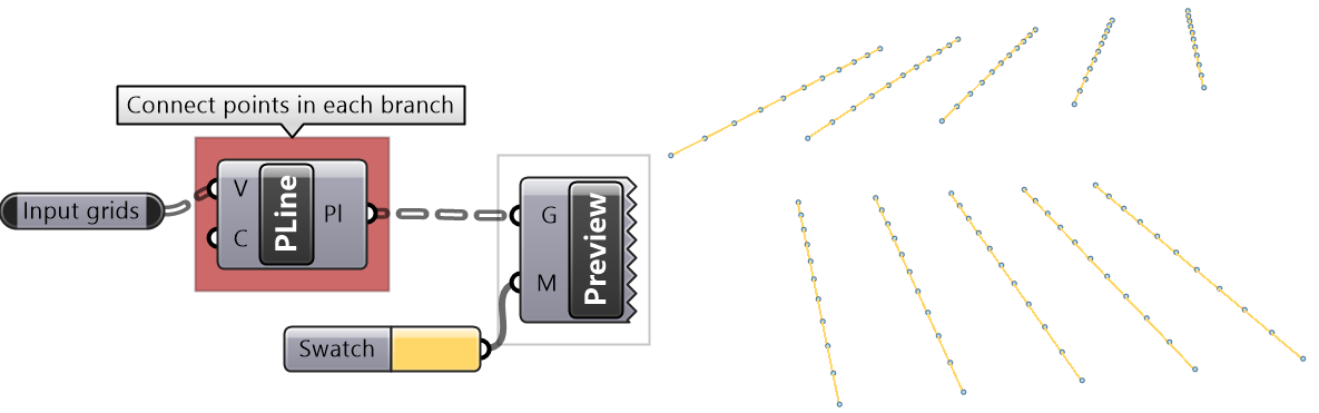 The following example examines different built-in mapping in the Path Mapper and how it changes the data structure. The Polyline component creates one polyline through each branch of the tree. Notice how different mapping affect the result.