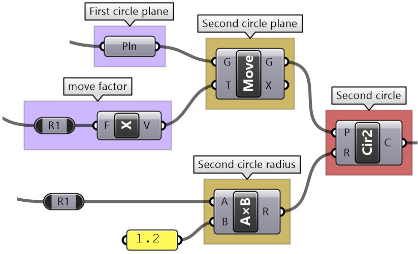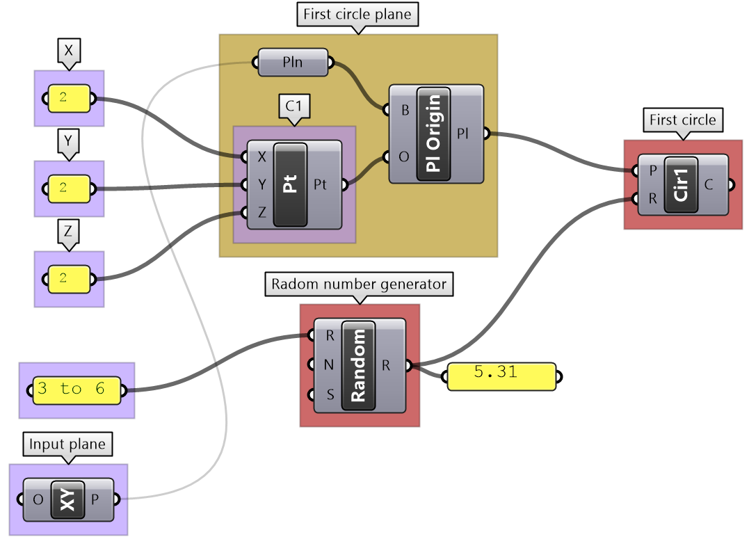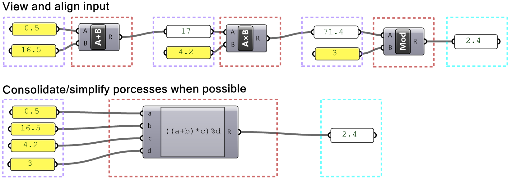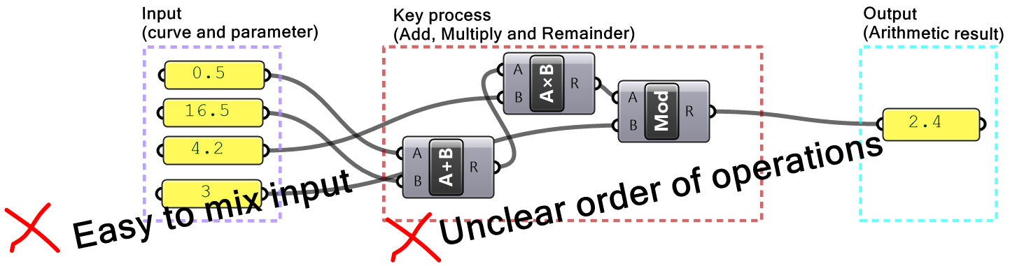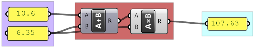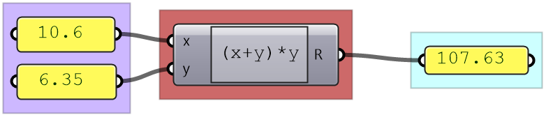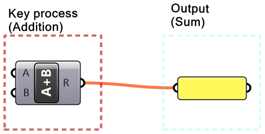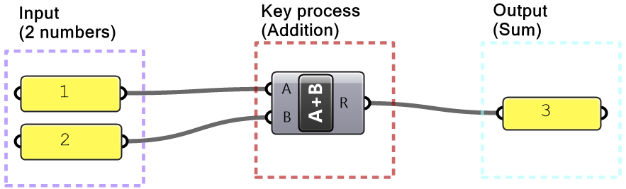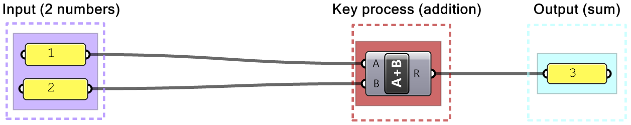 In Grasshopper, a solution flows from left to right. At the far left are input values and parameters, and the far right has the output. In between are one or more key processes, and sometimes additional input and output. Let’s take a simple example to help identify the three parts of any algorithm (input, key process, output). The simple addition algorithm includes two numbers (input), the sum (output) and one key process that takes the numbers and gives the result. We will use purple for the input, maroon for the key processes and light blue for the output. We will also group and label the different parts and adhere to organizing the Grasshopper solutions from left to right.