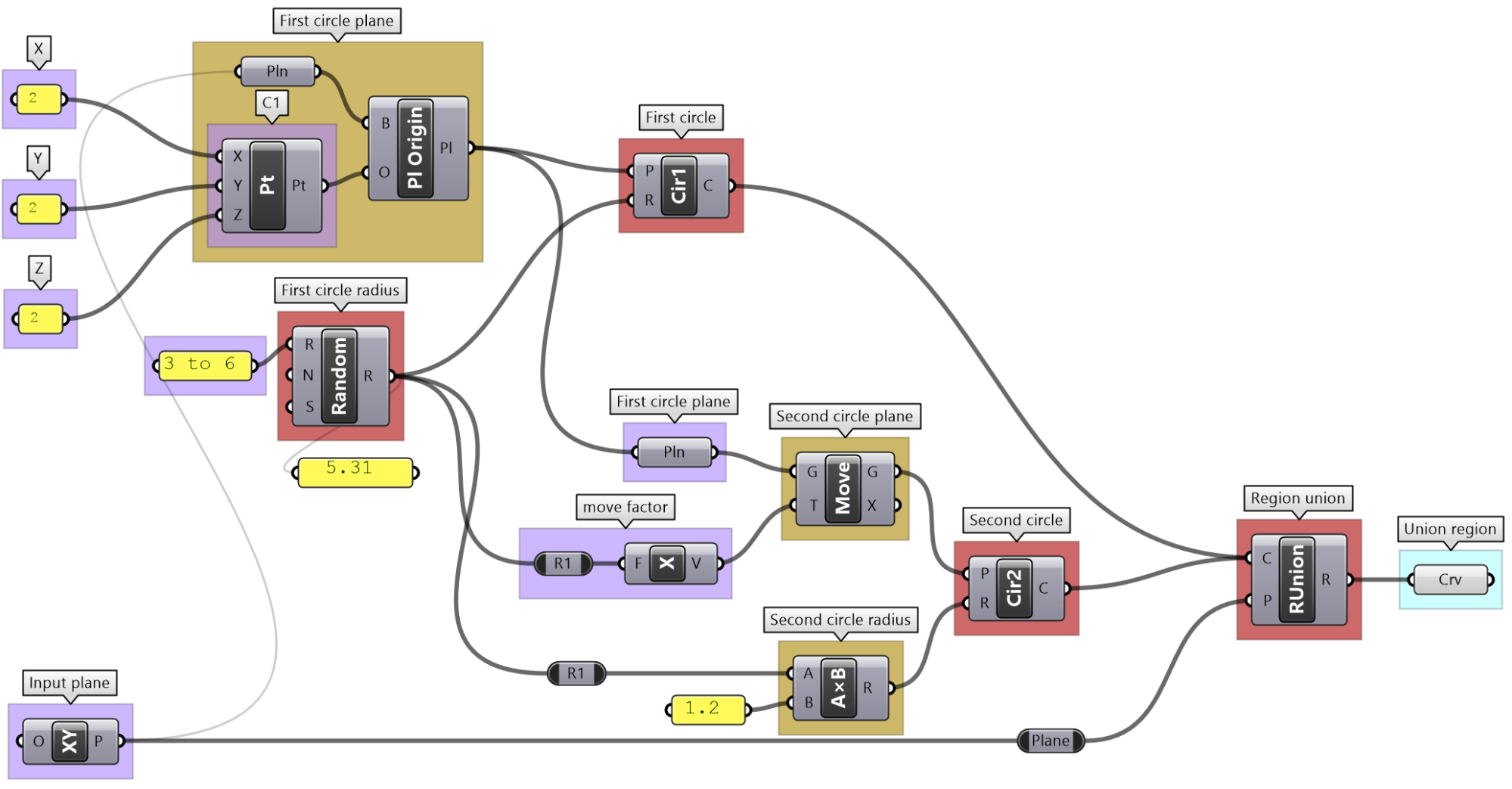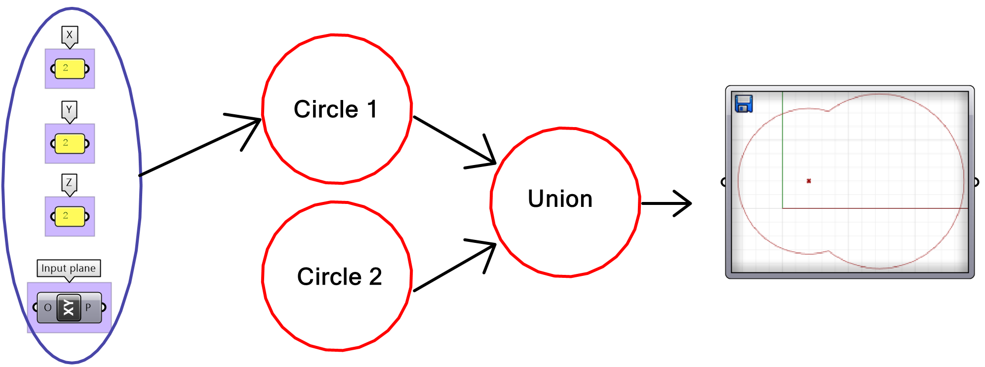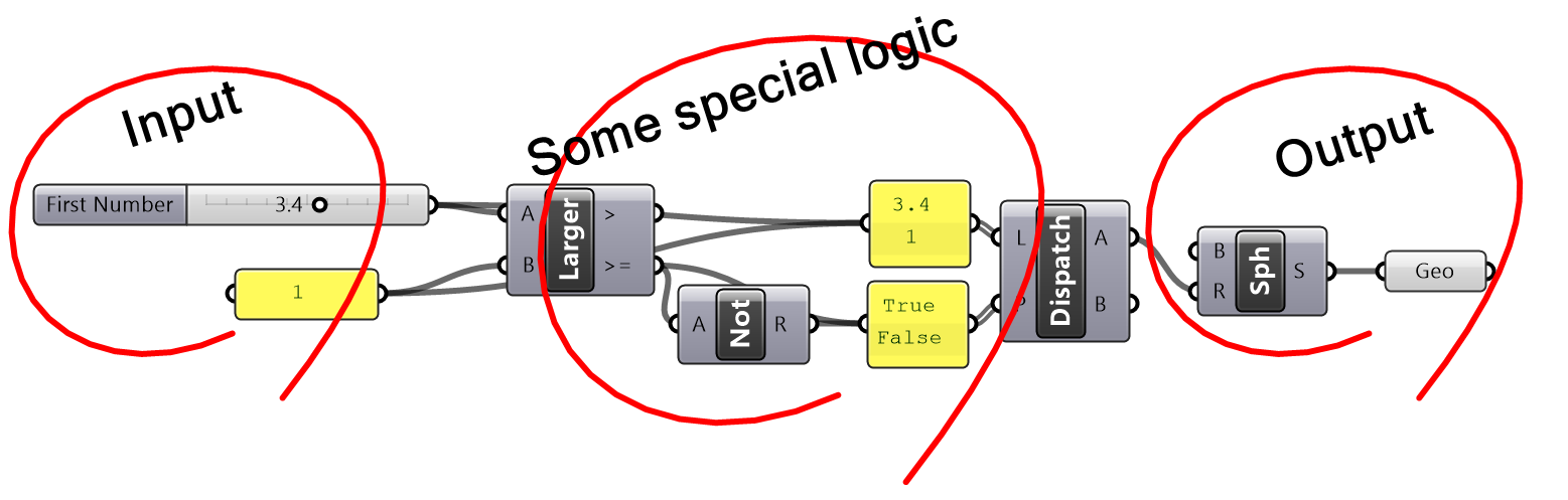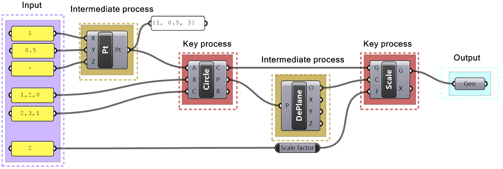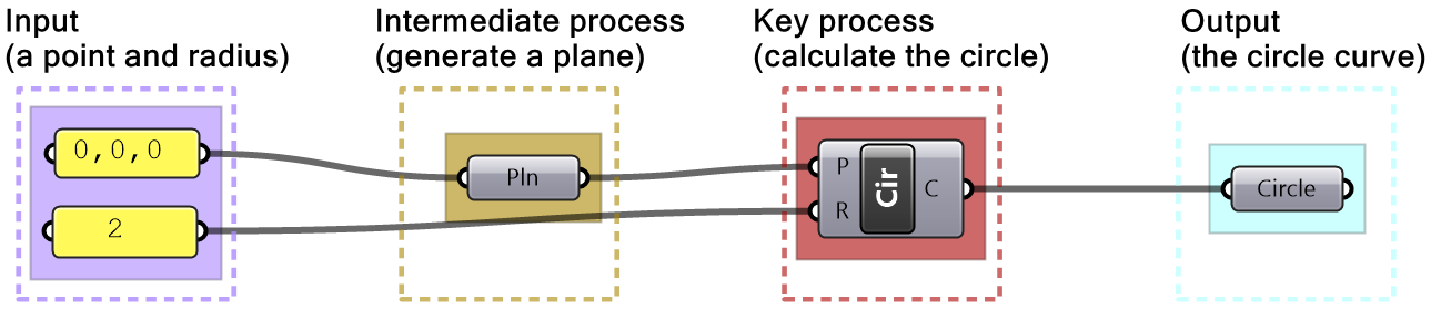Solution...In order to figure out what the algorithm is meant to do, we need to group the input on the left side, and collect the output on the right side, then organize the processes in the order of execution. We then step through the solution from left to right to deduce what it does. We can examine and preview the output in each step. The example of the tutorial is meant to create a circle that is twice as large as another circle that goes through three given points. One of the points is constructed out of its 3 coordinates.