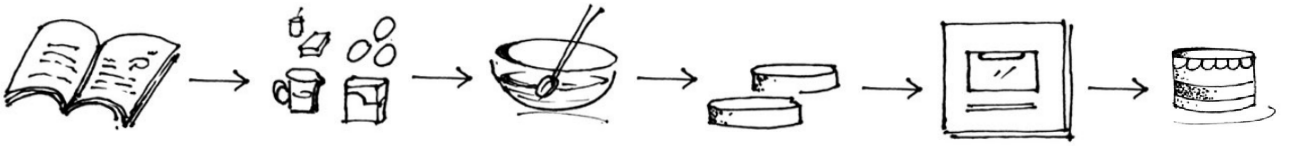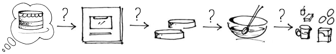 Back to our example, the task of baking a cake is much harder if you don’t have a recipe to follow and have not baked one before. You will have to guess the ingredients and the process. You will likely end up with bad results in the first few attempts, until you figure it out! In general, when you create a new recipe, you have to follow the process in reverse. You start with an image of the desired cake, you then guess the ingredients, tools and steps. Your thinking goes along the following lines:
