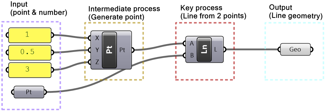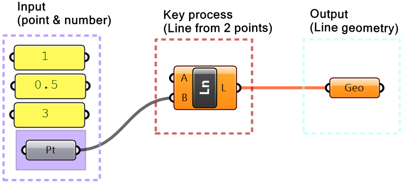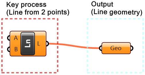 | 2. Key processes: Identify a key process that generates a line from 2 points. Use the Line component in Grasshopper |