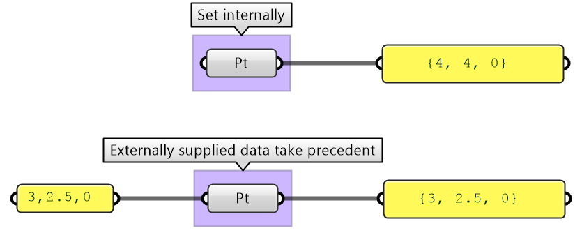 In Grasshopper, there are three main ways to supply data to processes (or what is called components): internal, referenced and external.