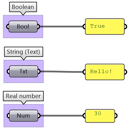 All programming languages identify the kind of data used in terms of the values that can be assigned to and the operations and processes it can participate in. There are common data types such as Integer, Number, Text, Boolean (Boolean type can be set to True or False), and others. Grasshopper lists those under the Params > Primitives tab.