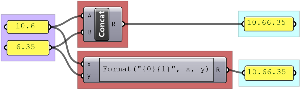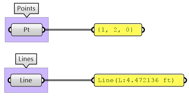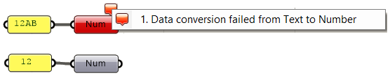 If the input is of the wrong type or is invalid, GH changes the color of components to red or orange to indicate an error warning, with feedback about what the issue might be. This is helpful, but sometimes faulty input goes unnoticed if the components assign a default value, or calculate an alternative value to replace the input, that is not what was intended. It is a good practice to always double check the input (hook to a panel or parameter viewer and label the input). To avoid using wrong types, it is advisable to convert to the intended type to ensure accuracy.