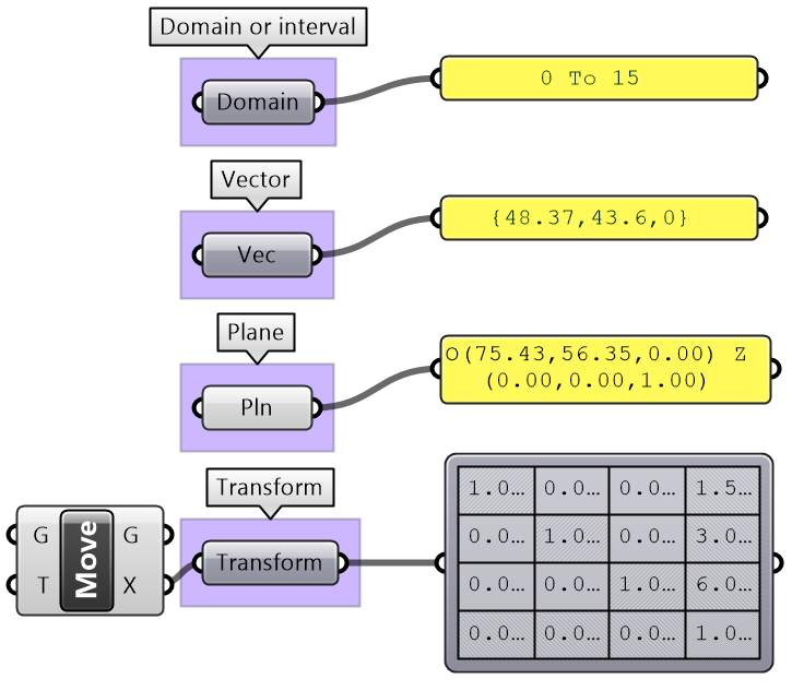 There are other mathematics types that designers do not usually use in 3D modeling, but are very common in parametric design such as Domains, Vectors, Planes, and Transformation Matrices. GH provides a rich set of tools to help create, analyze and use these types. To fully understand the mathematical as well as geometry types such as NURBS curves and surfaces, you can refer to the Essential Mathematics for Computational Design book by the author