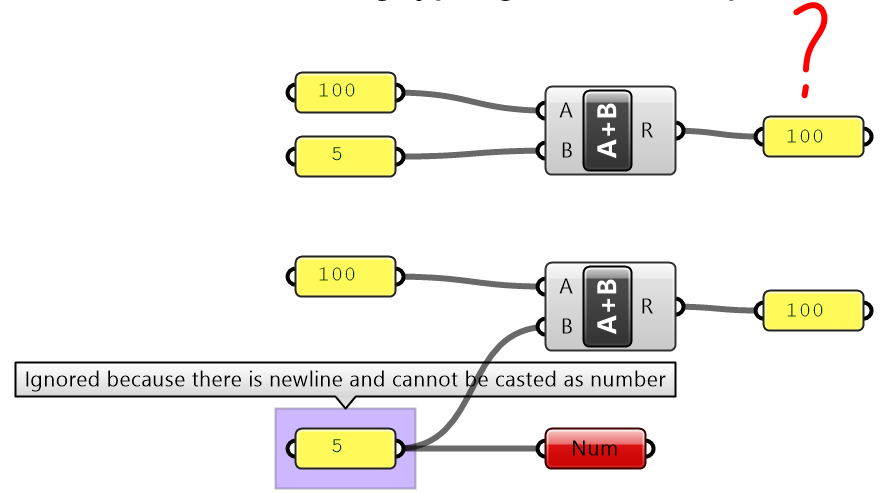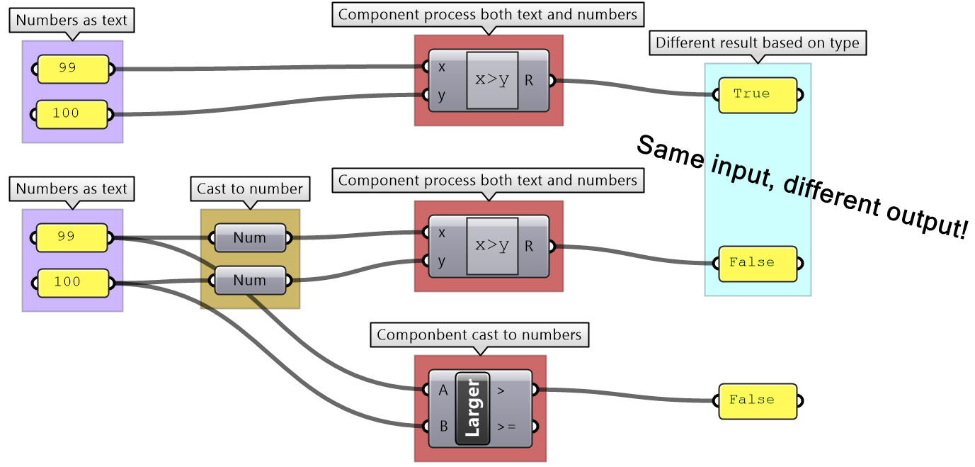 Grasshopper components internally convert input to suitable types when possible. For example, if you feed a “text” to Addition component, GH tries to read the text as a number. If a component can process more than one type, it uses the input type without conversion. For example, equality in an expression can compare text as well as numbers. In such case, make sure you use the intended type to avoid confusion.