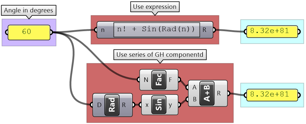 Numeric operations include operations such as arithmetic, trigonometry, polynomials and complex numbers. GH has a rich set of numeric operations, and they are mostly found under the Math tab. There are two main ways to perform operations in GH. First by using designated components for specific operations such as Addition, Subtraction and Multiplication.