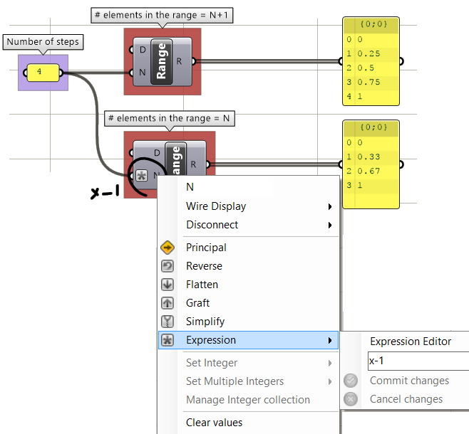 It is worth mentioning that most numeric input to components allow writing an expression to modify the inputs inline. For example, the Range component has N (number of steps) input. If you right mouse click on “N”, you can set an expression. You always use “x” to represent the supplied input regardless of the name.