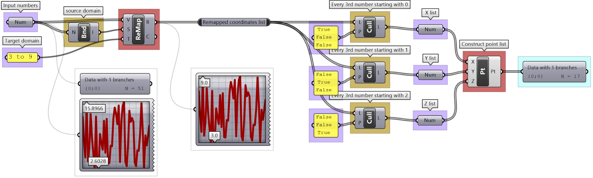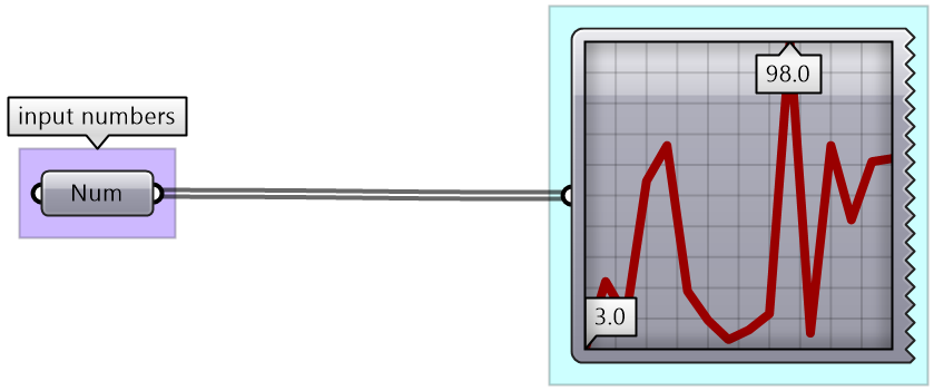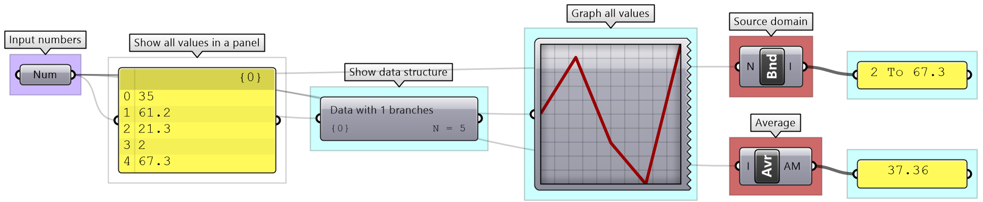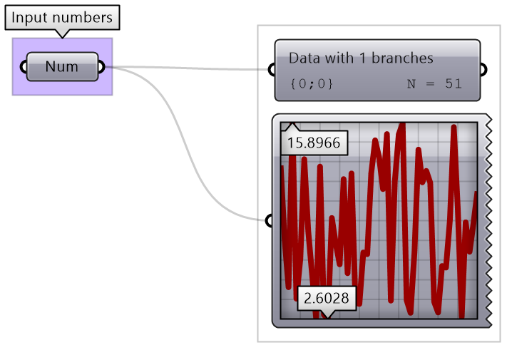 There are many tools in GH to examine and preview data. Panel is used to show the full details of the data and its structure, while the Parameter Viewer shows the data structure only. Other analysis components include Quick Graph that plots data in a graph, and Bounds to find the limits in a given set of numbers (the min and max values in the set).