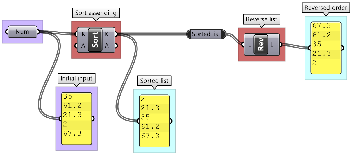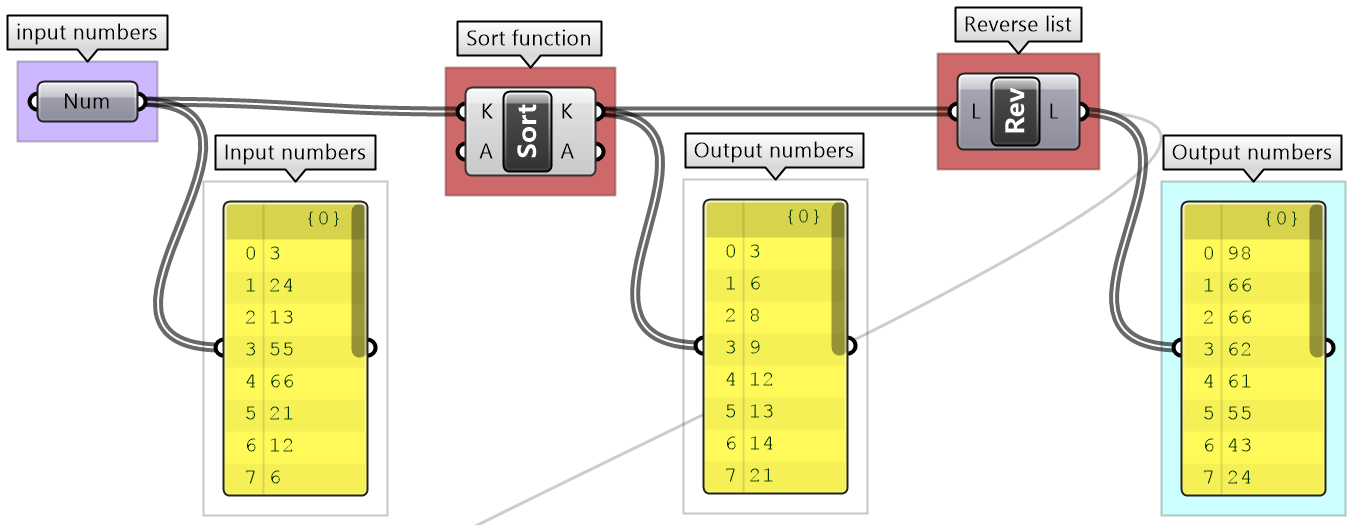 GH has designated components to sort numeric and geometry data. The Sort List component can sort a list of numeric keys. It can sort a list of numbers in ascending order or reverse the order. You can also use the Sort List component to sort geometry by some numeric keys, for example sort curves by length. GH has components designated to sort geometry sets such as Sort Points to sort points by their coordinates.